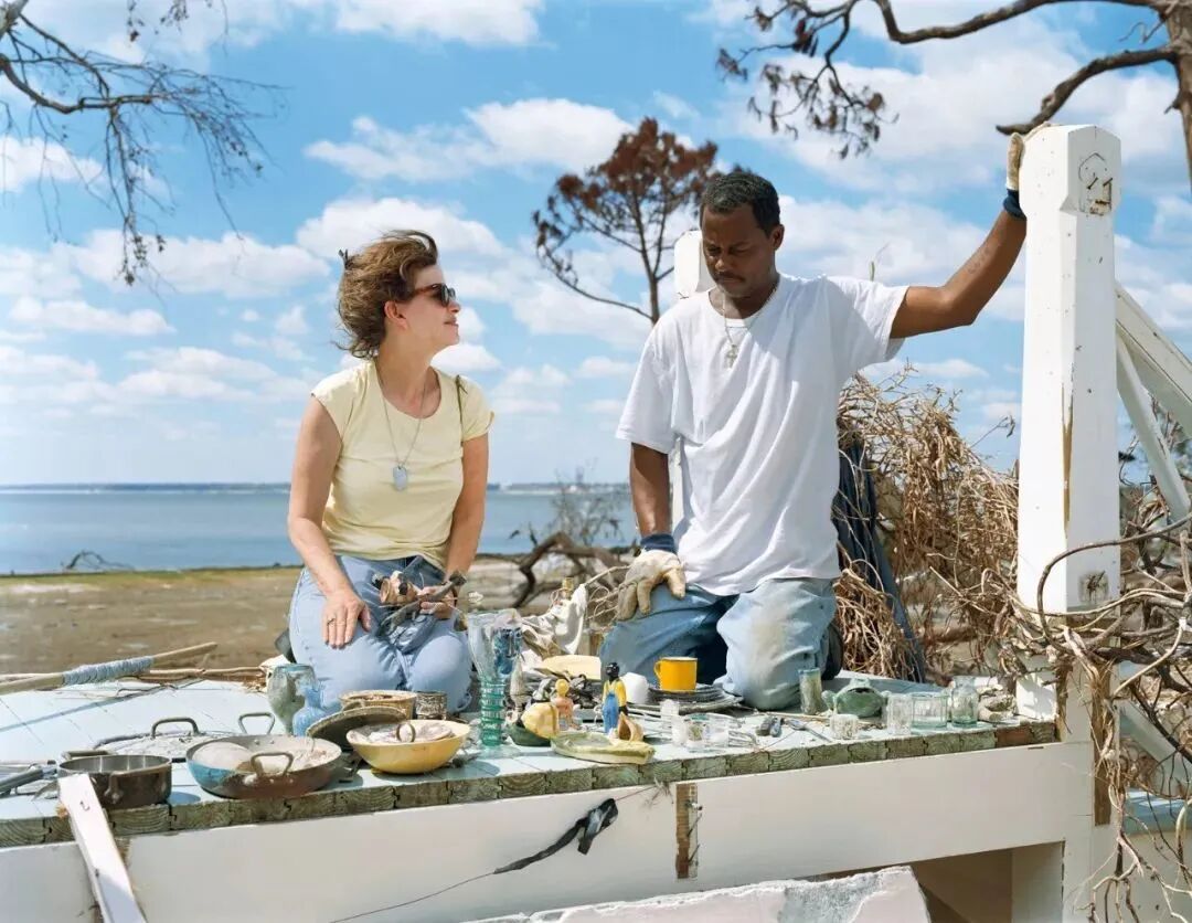 上面的照片,席梦思床垫,挂在大树的枝杈上,棕榈树夭折,汽车翻覆,但阳光却仍明媚。