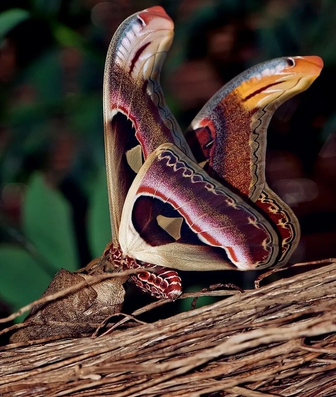 下图看起来有点像两个蛇头,其实是阿特斯飞蛾的翅膀,这种飞蛾体型可达一只手掌大小~