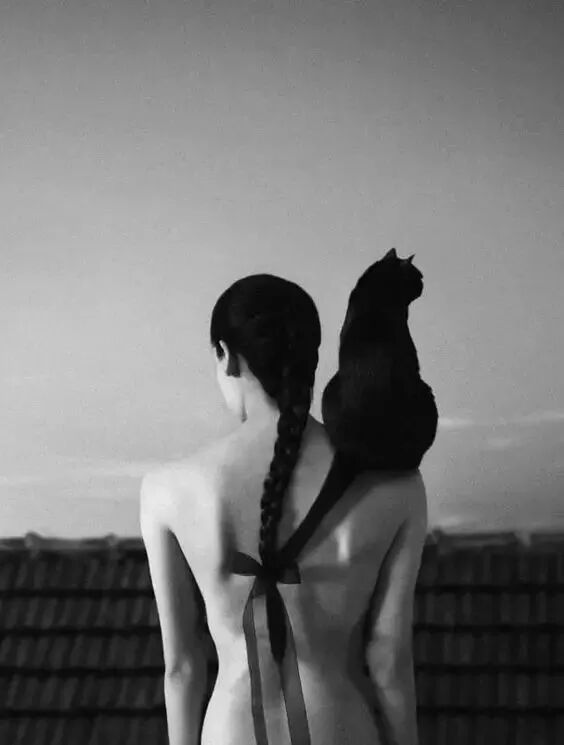 肩上坐着一只安静的黑猫,一个看着左下方,一个目光投向右上方。
