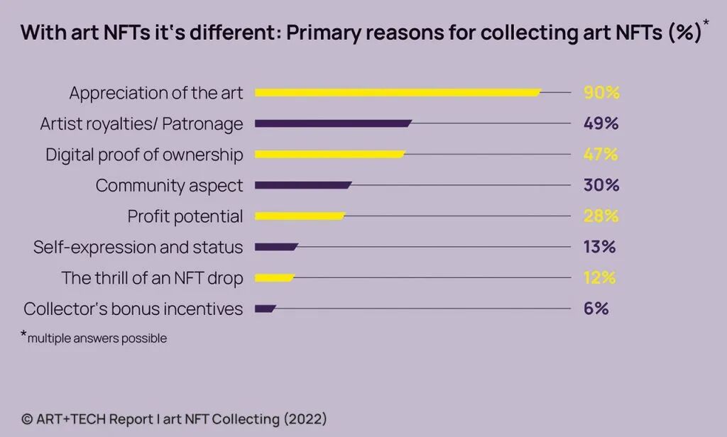 除了艺术兴趣和美学追求的推动外,这份报告也指出,NFT收藏品能够提供的数字所有权证明和数字艺术赞助途径,也同样是推动NFT艺术购买的关键因素。