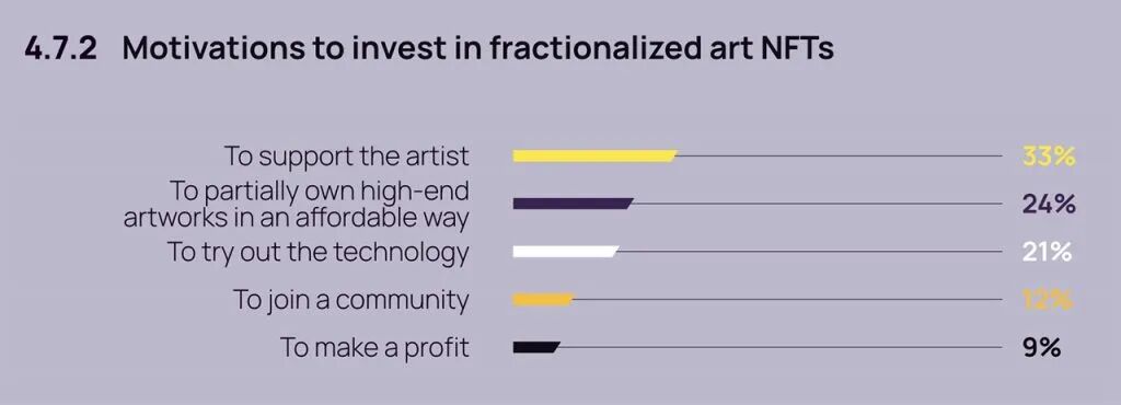 同样值得注意的是,超过一半的调查对象表示,当他们购买NFT时,社群感是至关重要的,而F-NFT恰恰能通过其共享所有权模式满足购买者的这种需求。当一幅画被数量限定的一群人共同拥有,一个社群便会自然地建立,并靠这些人共享的艺术兴趣、品味、观点和利益而巩固深化。