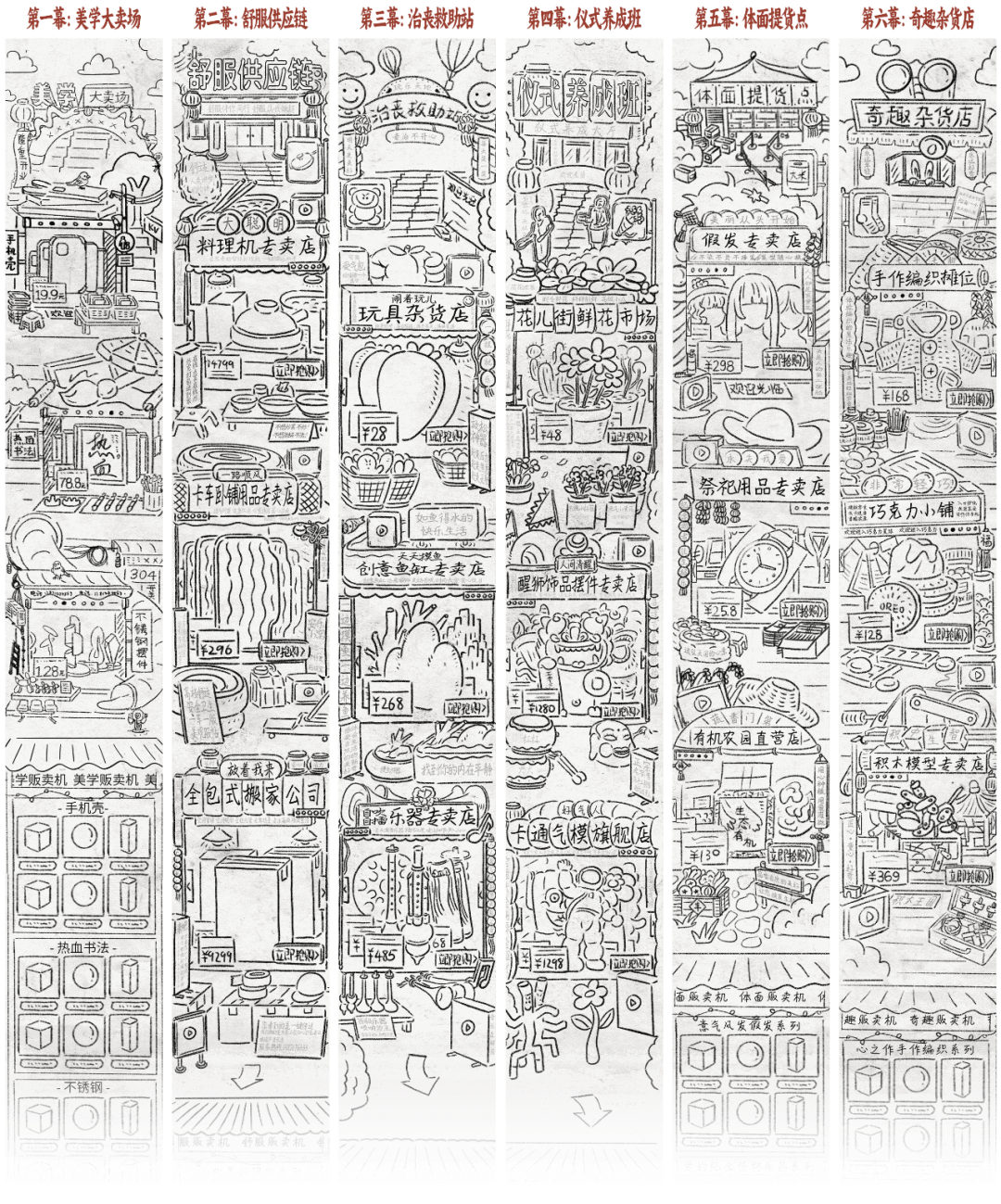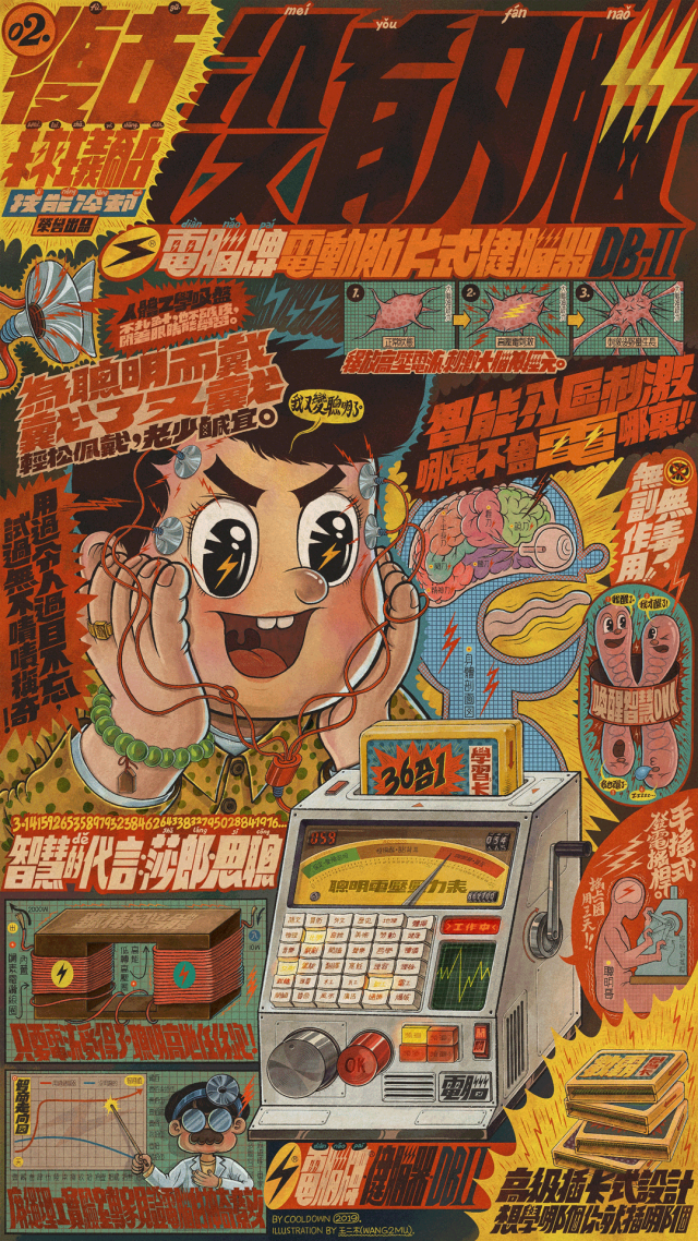 本次美学大卖场背后的设计师也大有来头,他是COOLDOWN (技能冷却)创始人兼视觉总监王二木。王二木标志性的风格让他早早出圈,他的笔触细腻,画面信息量极复杂,元素丰富风格统一。