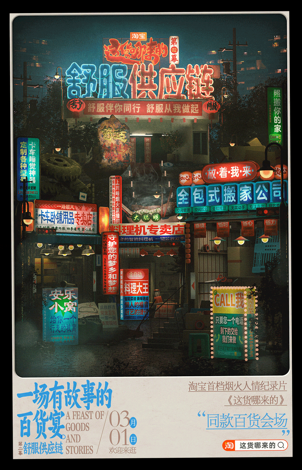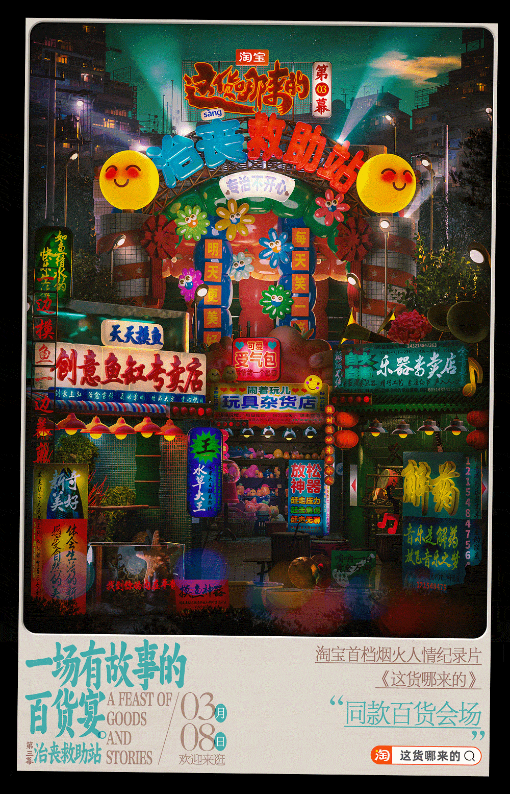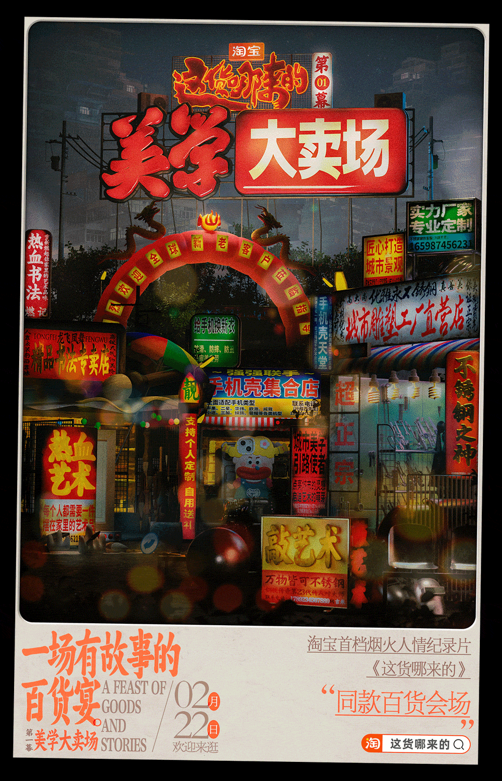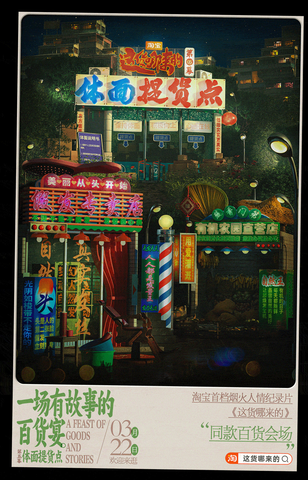 和纪录片一同上线的还有淘宝的赛博野摊的6集互动会场,淘宝邀请了国内知名设计师王二木,围绕着具有新奇感与烟火气的中式街头做了一个线上的烟火气市集。