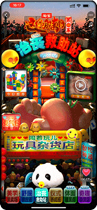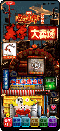 活动首页轮播着《这货哪来的》主人公的店铺和商品,进入“看这货摆摊”,页面中藏有不少惊喜彩蛋,比如进入页面之后不定时飞出麻雀落在屏幕中,勾起人的好奇,同时表现了小小的野摊凝聚着烟火气。点击灯箱招牌变闪烁、气模会扭动,点击贩卖机下方的按钮会捡到一个吉利蛋、贩卖机选购商品时模拟游戏卡片设计沉浸式加购。