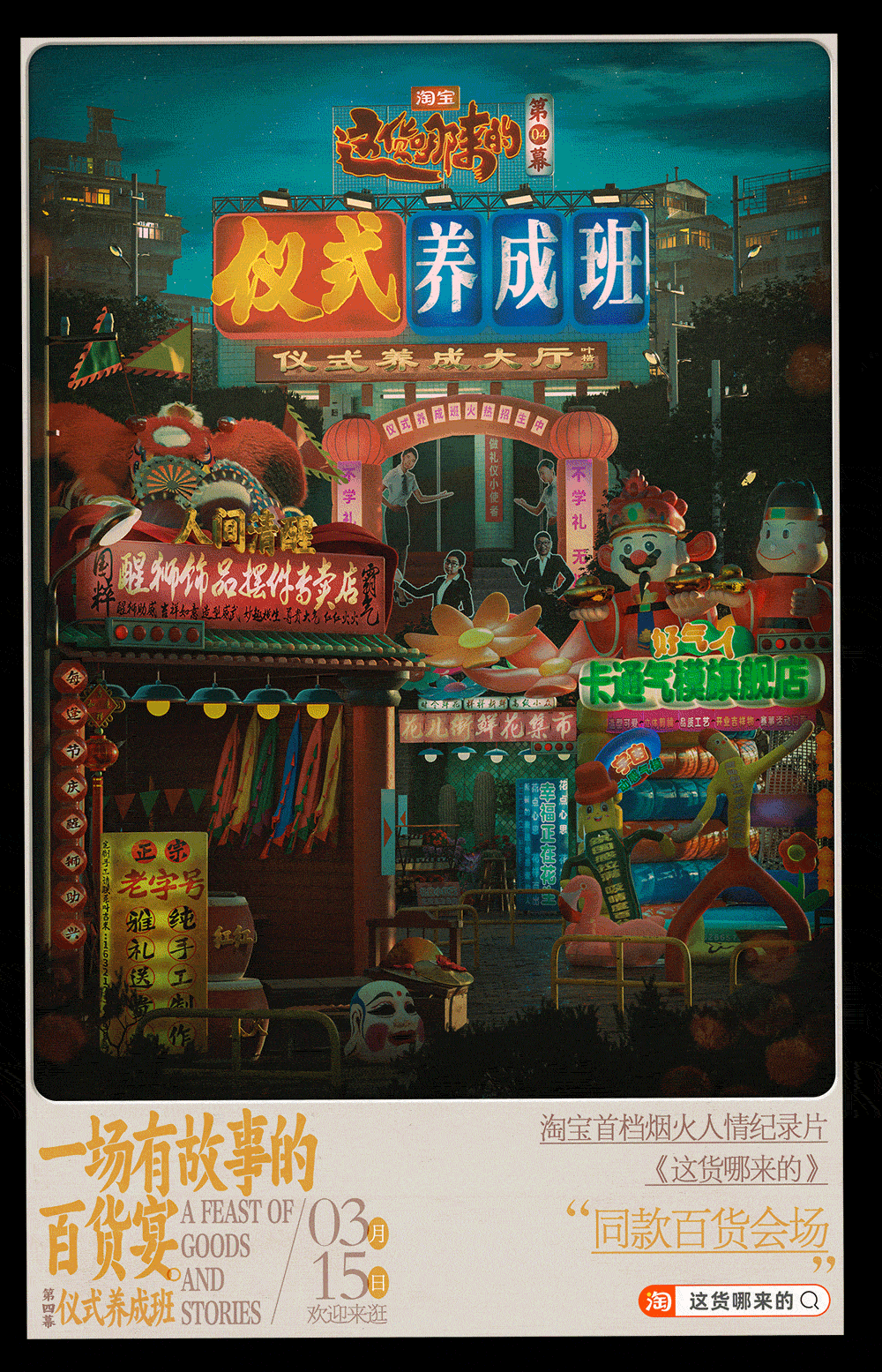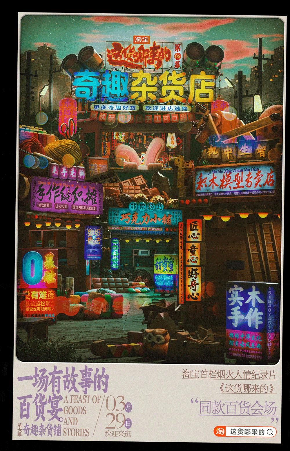 场景结构设计了6个中式街头:美学大卖场、舒服供应链、治丧救助站、仪式养成班、体面提货点、奇趣杂货店,和纪录片《这货哪来的》分集主题保持一致,其中包含的17个商铺,每个商铺的商品是根据片中场景来二次创意定制。