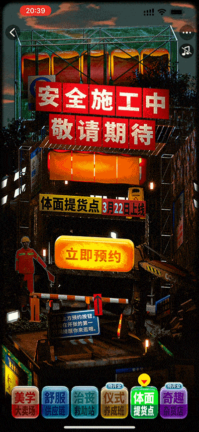 进入界面需要“乘坐电梯”,搭乘破旧的、随处是牛皮癣广告的铁艺电梯,将整体视觉氛围一下子沉浸到老淘宝那种烟火气十足的万物世界。