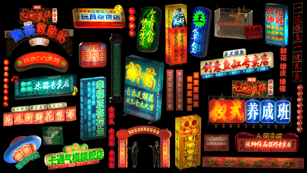 除了复古的场景,文案也非常有趣“天天摸鱼创意鱼缸店专卖店”“自吹自擂乐器专卖店”谐音梗“花点心思,花样百出,幸福正在花生”土味金句“舒适,人类进步的阶梯”,这些店铺仿佛和生活不太接近,给人一种魔幻现实的感觉。