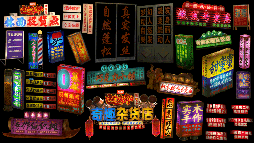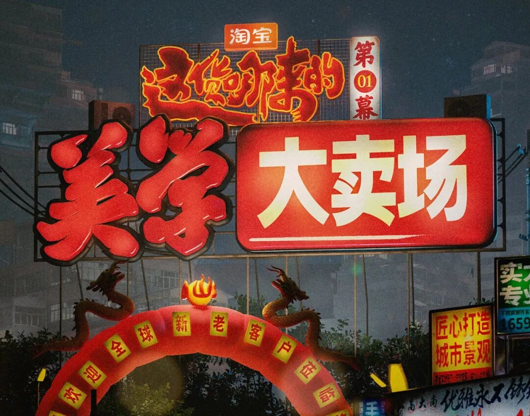 此次淘宝赛博野摊会场整体概念为呈现中国80、90年代的市井烟火气。这种街头复古风格一些细节不注意会很容易做成港风,可以看出设计师牢牢把握住了80、90年代街头的核心元素,对视觉调研下了很大功夫。