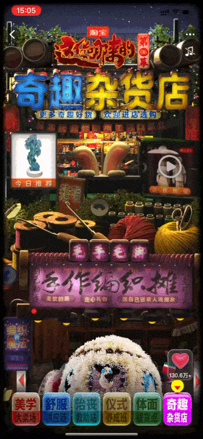 做这种内容互动型的会场,淘宝也并非初次尝试,早在前几年就开始了“直播未来城”赛博朋克风格为主打,主城区由中央车站、探险水晶岛、商业大道、超炫摩天轮、未来植物园等八大场景共同组成。还有“头号玩家”“淘宝人生”等出圈内容,不断拉进人与商品的连接,刷新用户对边逛边玩的体验。在设计上保持高水准输出,不断制造出刷屏级的交互页面,丰富内容打造讨论热度。