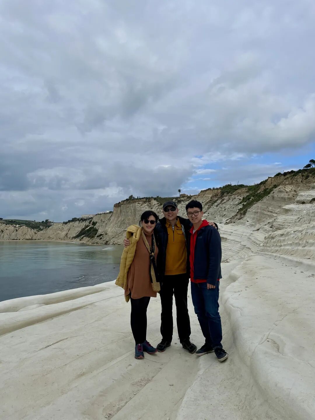 2021年12月,吴少湘和夫人蒋朔、儿子吴飒在意大利西西里岛的“土耳其阶梯”合影,这是新冠疫情后的第一次全家出国旅行休假