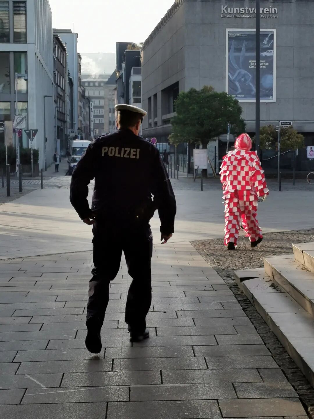 一个警察在杜塞尔多夫艺术协会门口尾随一个准备参加庆祝活动的小丑