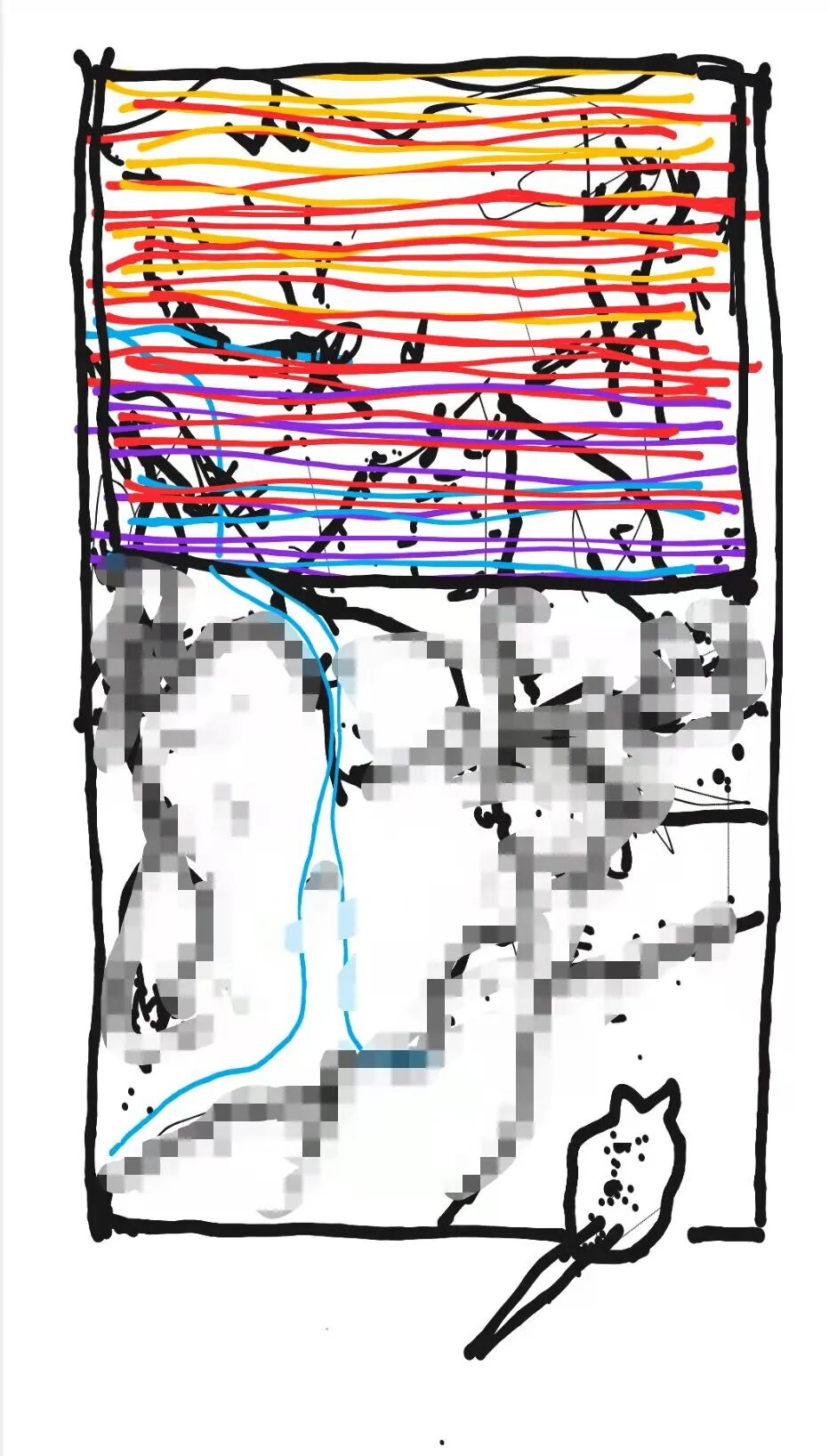 A:大部分时间待家里,毕竟不是国内大一些的画室,刚开始画了一些纸上作品,中间因为家庭有一些变故导致情绪不太稳定没怎么动笔,稳定下来之后用手机勾画了一批手机画,算是把路途上奔波的时间填充实了,然后画了一批小画,最近尺幅开始大起来,从数量上来讲,比以前多多了,当然大尺幅不多,我以前每年的产出率也不高,画的慢。