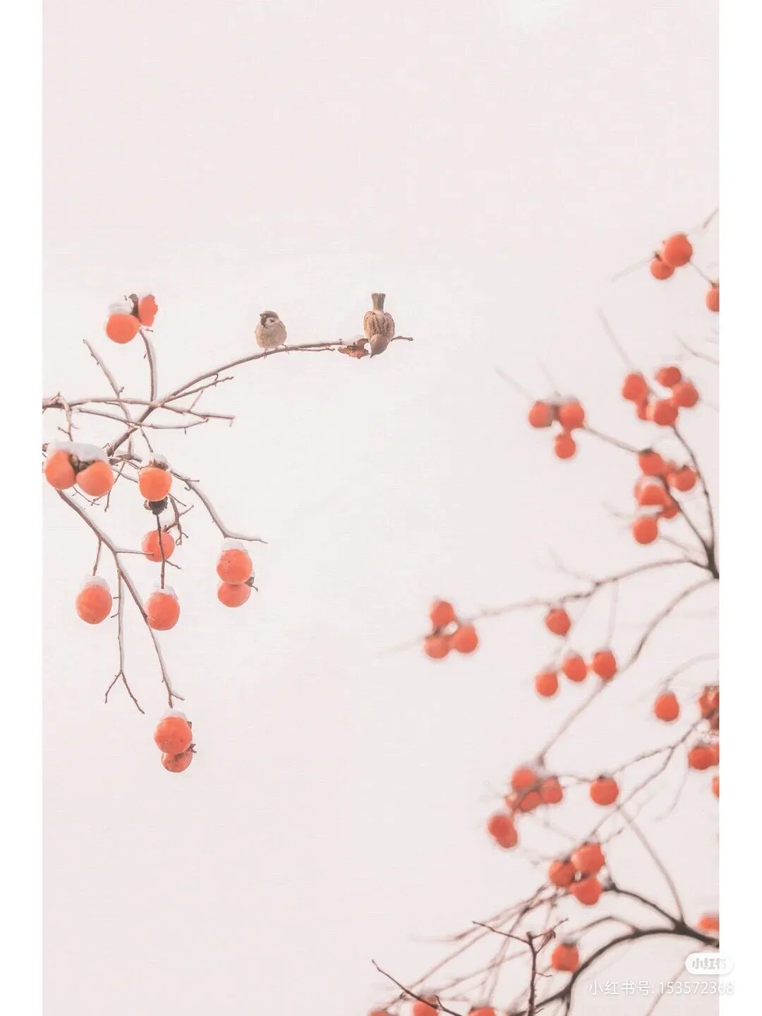 柿子树落叶了,果子还在坚持,它一次又一次地陪着这饱经风霜的宫城捱过秋风,捱过霜雪。直到白雪堆满它的枝头,澄红透亮柿子仍在其中点缀,是为了预告新年而点上的灯。