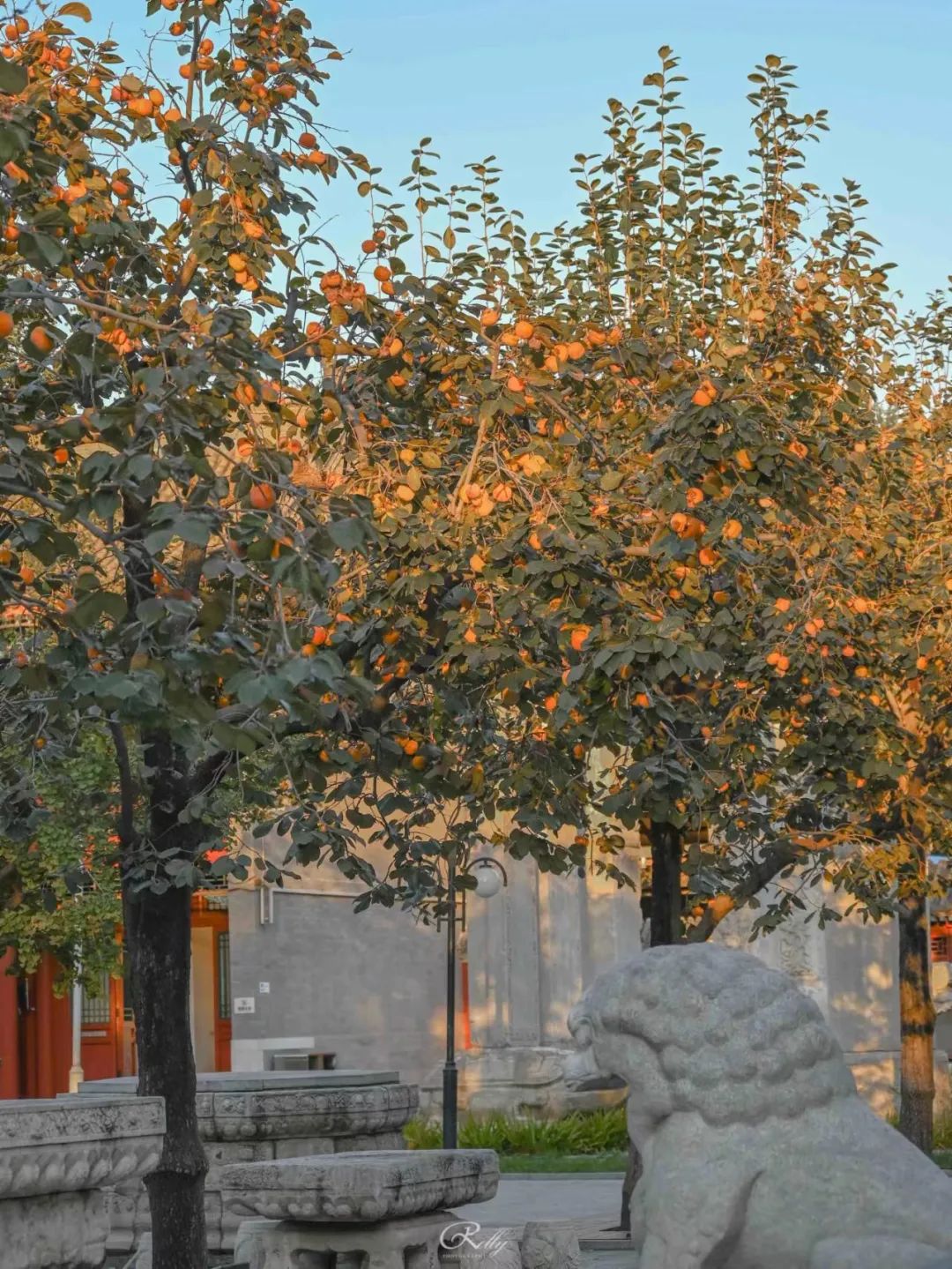 因为柿子不是可有可无的衬托,而是光明正大的主角,每每拍照,它都以不容忽视的存在感抢在镜头的最前面。它本身已是一景,却也能完美入景,与飞檐斗拱、瓦当脊兽配合,相得益彰。