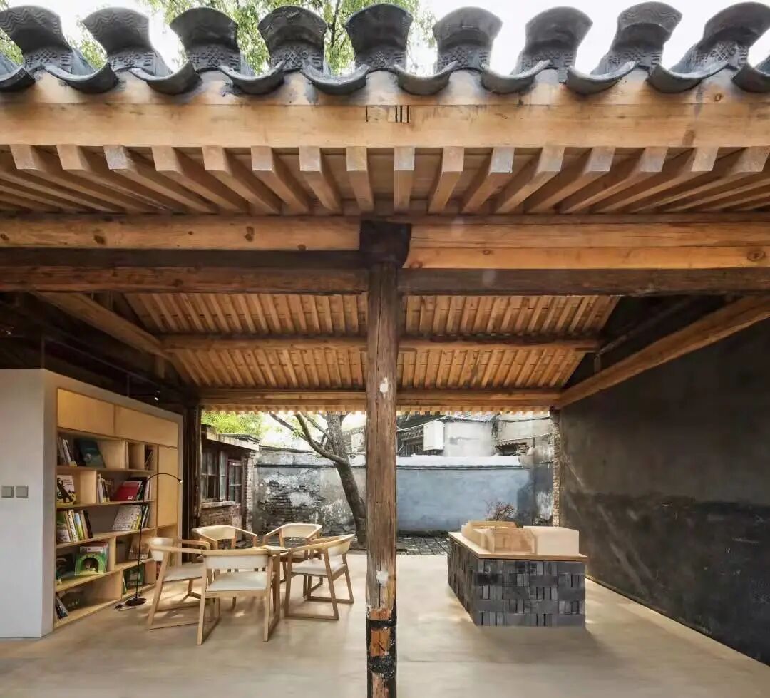 院子的用材同样精巧,“新”的小木模混凝土包裹了“旧”建筑的外轮廓,“旧”的小青瓦在内雕琢了“新”延伸交合的连续屋面,“新”与“旧”之间自然地延续了北京四合院和中国传统建筑的特色:外墙敦实封闭,内里通透开敞。