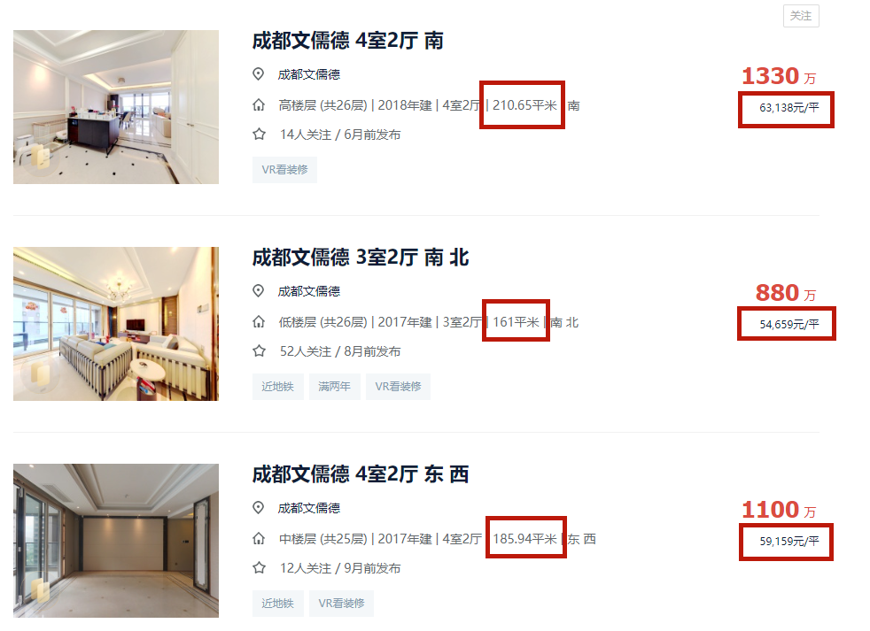 以成都文儒德和中海城南一号为例,同一小区,面积越大挂牌单价越高,200㎡以上户型就比150㎡左右户型每平米贵近万元。这也反过来推高了一手市场优质大平层的稀缺和抢手。