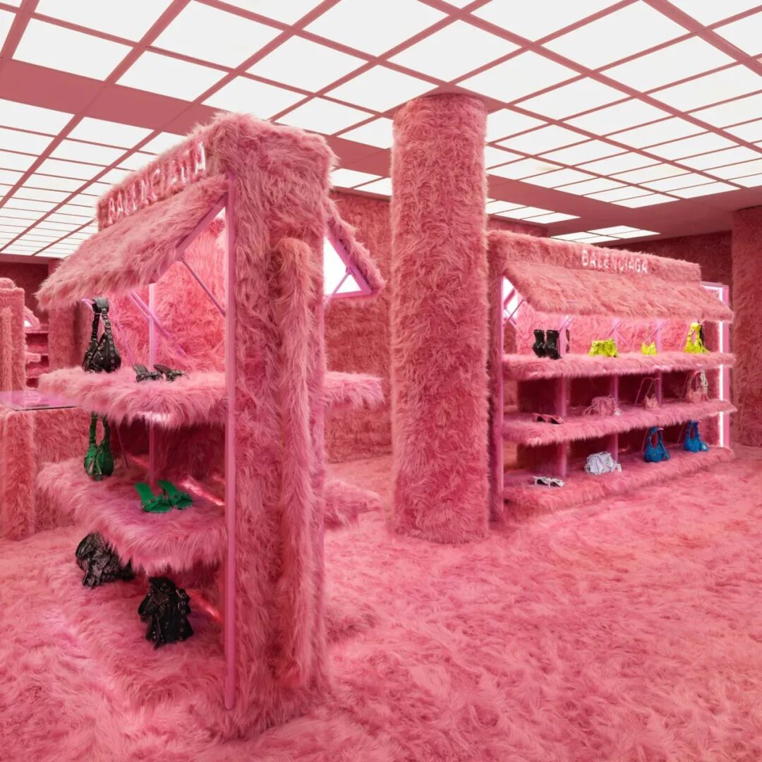 时尚品牌 Balenciaga 用蓬松的亮粉色人造皮草覆盖其位于伦敦的 Mount Street 商店,以庆祝其 Le Cagole 包袋系列及一系列配饰和鞋履的推出。