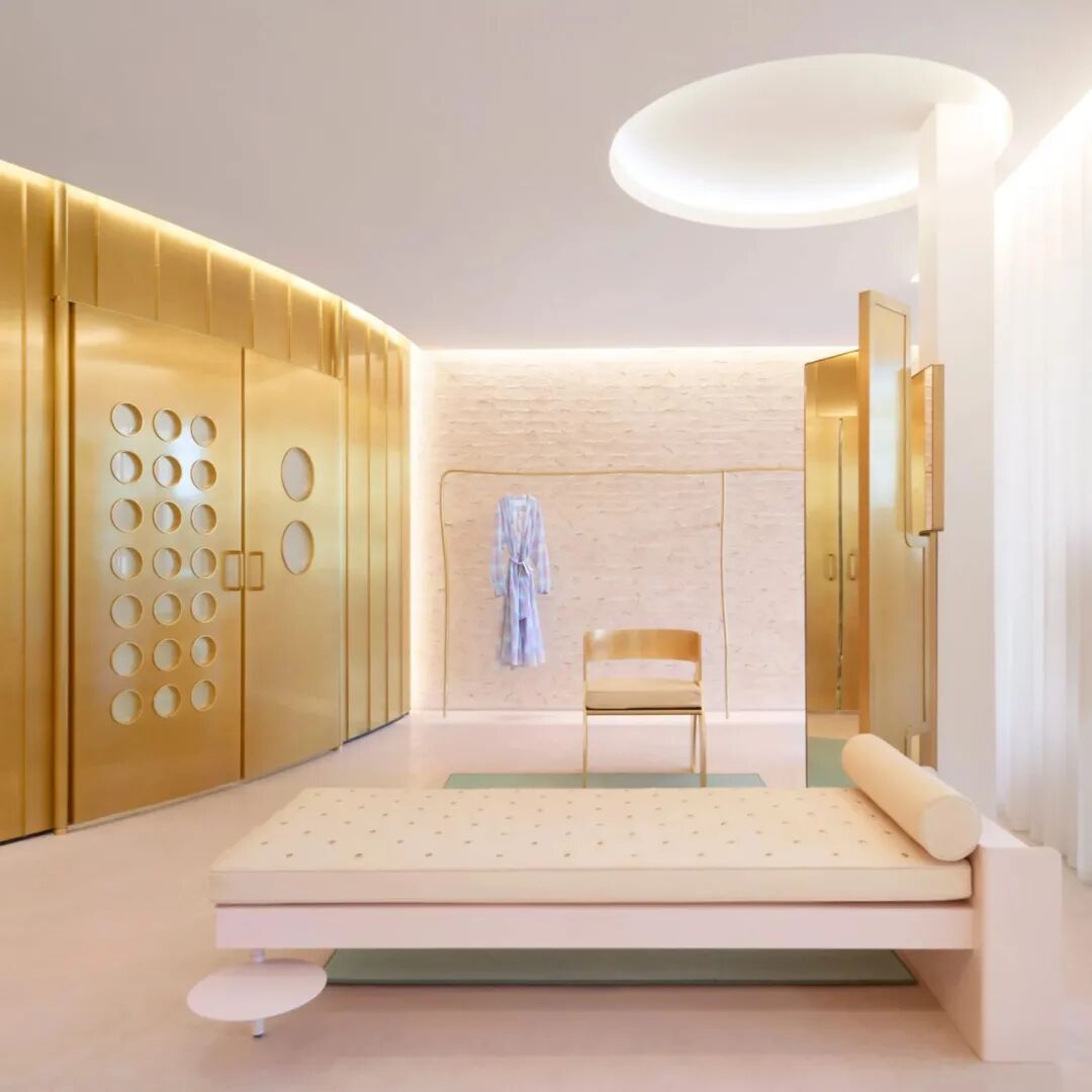 这家商店的灯具灵感来自 James Turrell 的艺术作品,一个圆形的金色更衣室和两块取自棕榈泉沙漠的巨石,在细纱窗帘前相互平衡。