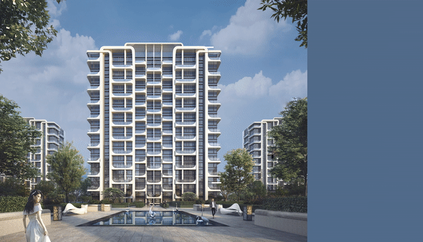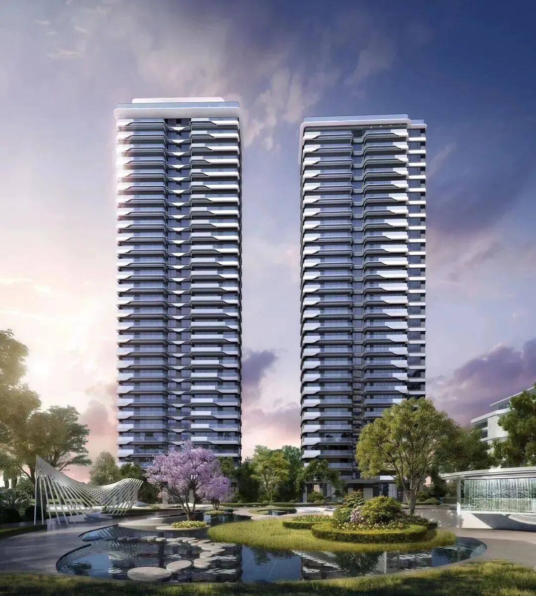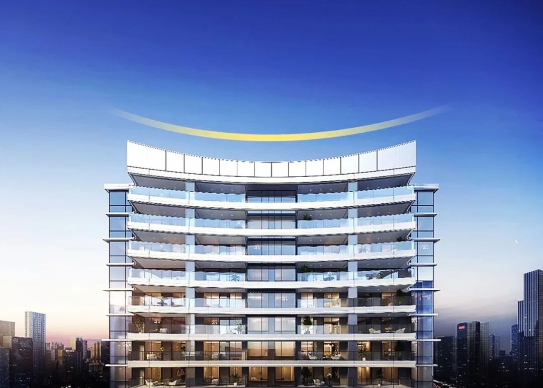 高层产品外立面处理上,参考“叠涩”手法,通过层层向外挑或向内收的垒砌方式为立面增加韵律感,再加上极简弧形建筑线条、弧形转角等,使得建筑整体外形典雅柔美。