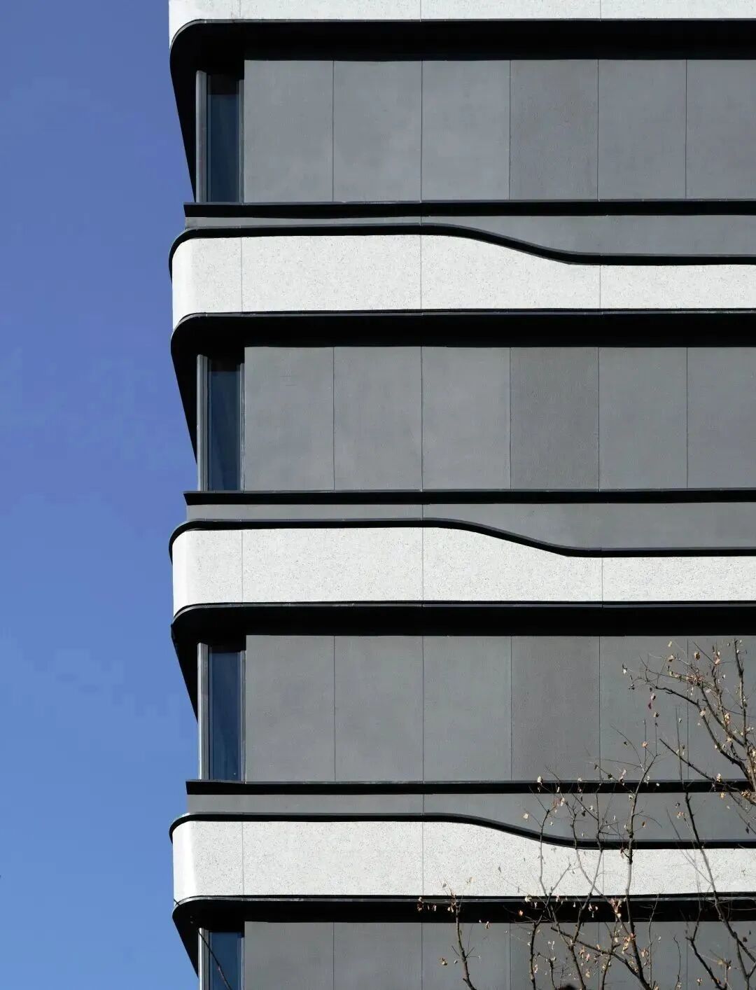 玻璃、铝板、石材、金属线条的大胆碰撞,形成了极具未来感的流体立面,多了几分机械美学的韵味。