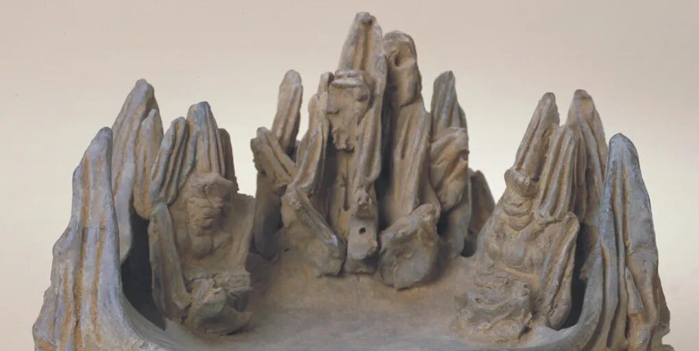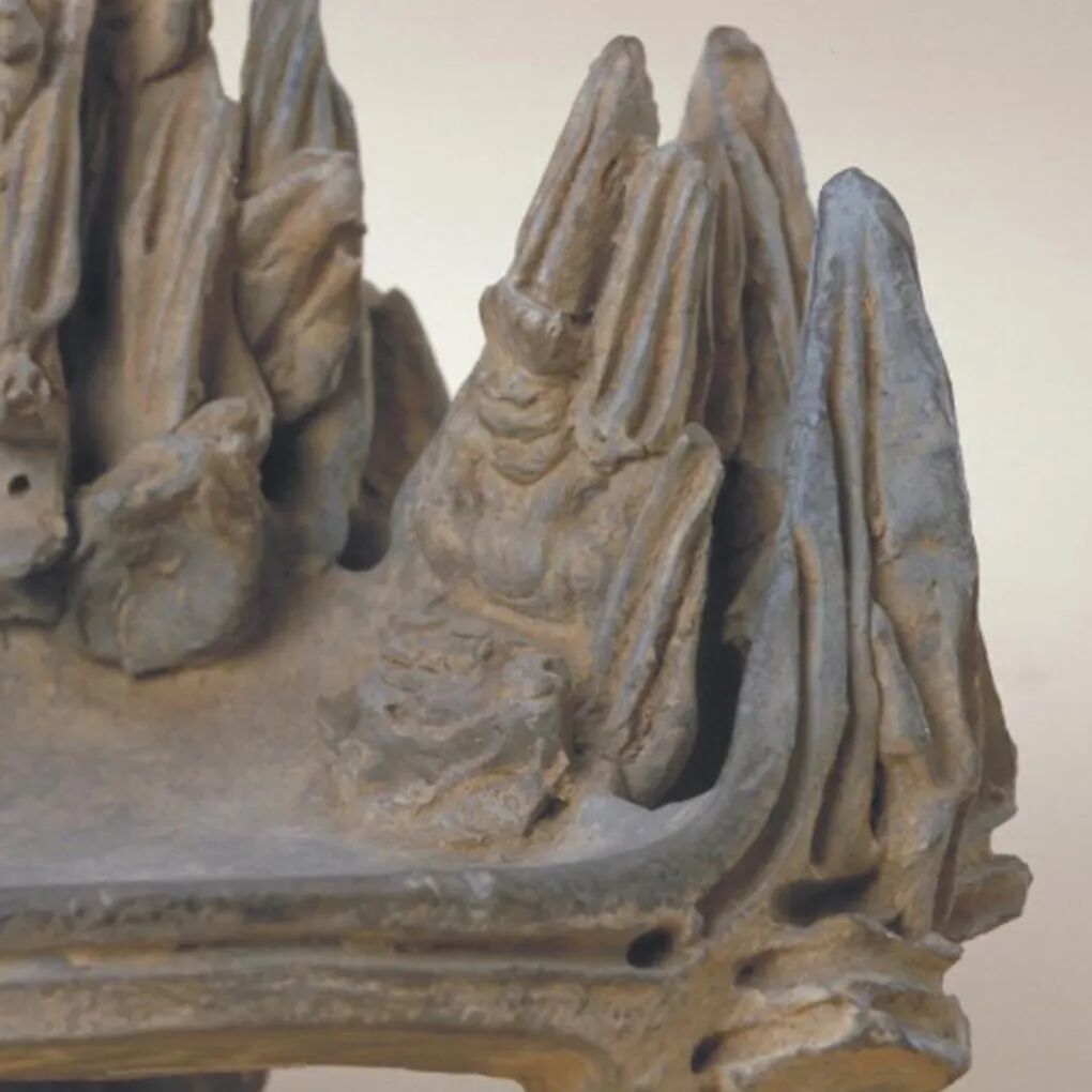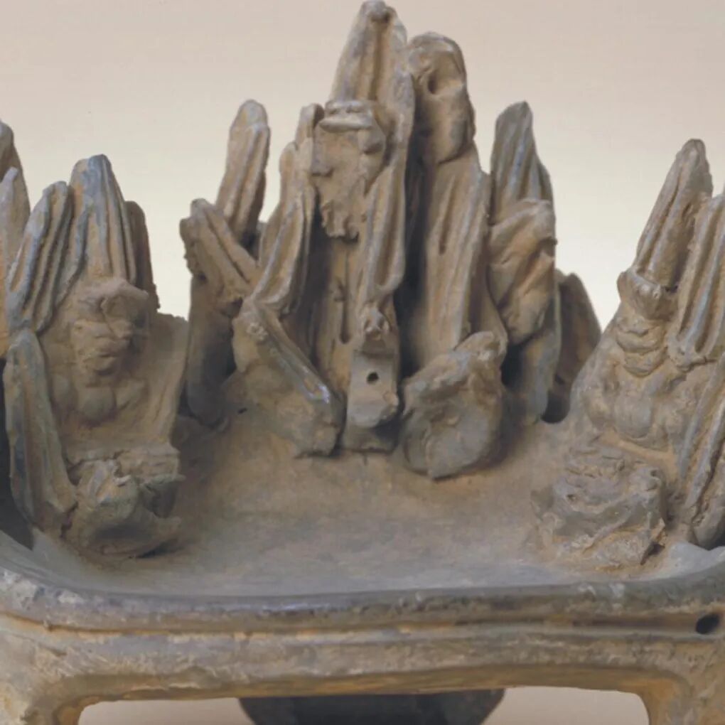 大家好!今天给大家介绍,唐代文物《十二峰陶砚》通高17.9厘米,宽21.5厘米,径18.5厘米。