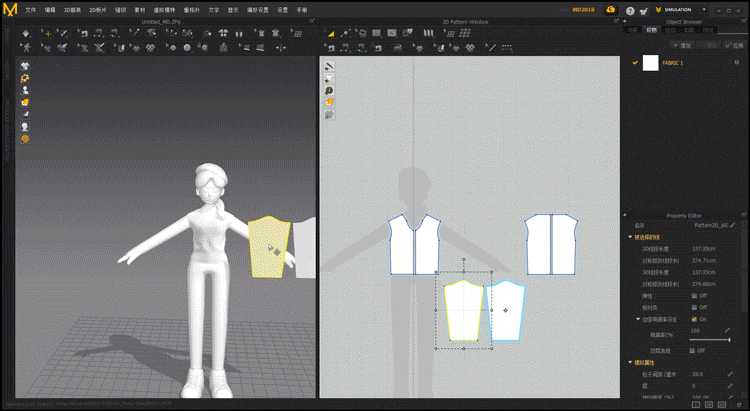 界面左侧收起的面板可以调出,涵盖资源库,可以购买一些已经创建好的资源,也可以调出一些系统预制的模型。界面最右侧的面板,是一些布料属性的编辑器。
