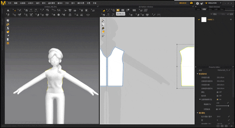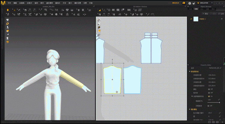 绘制好想要的袖子版片之后,将其移动到大致的位置,与衣身进行缝合,另一个袖子同样采用上述方式来制作。模拟时,版片会自然下落,对没有缝合的版片进行冷冻,保持其模拟时的形状。