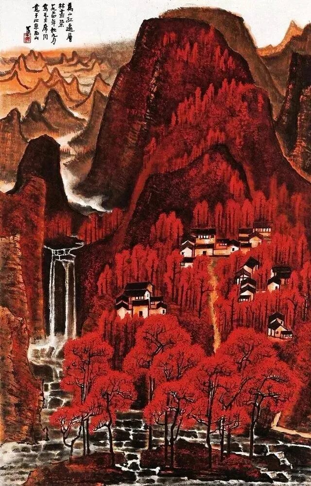 《万山红遍》是成就李可染在中国近现代画坛地位的里程碑式作品。该画题材取毛泽东“看万山红遍,层林尽染”诗意而成。1962至1964年之间,李可染偶得半斤故宫内府朱砂,大胆尝试用朱砂写积墨山水,总共创作7幅《万山红遍》。