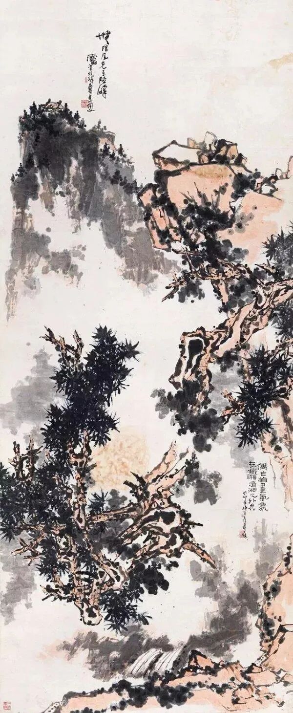 《无限风光》整幅气势憾人,一股浩然之气贯穿画面。巨石自画面右侧斜倚,极险!苍松老干自悬崖下方向画面左下角斜出而去,若“单鞭下势”,更险!然苍松如虬龙自左下方腾跃而起,一举“化险为夷”!且腾势而起、趁势而上、一上再上,至悬崖、至顶峰、至顶峰而上的风轻云淡。此时回望,画幅右下流出的一截清泉仿佛分外可爱,为险境增加了平衡的力量。这就是潘天寿的构图能力,惊心动魄,制造冲突又化解冲突,造险、破险!冲战、破局!