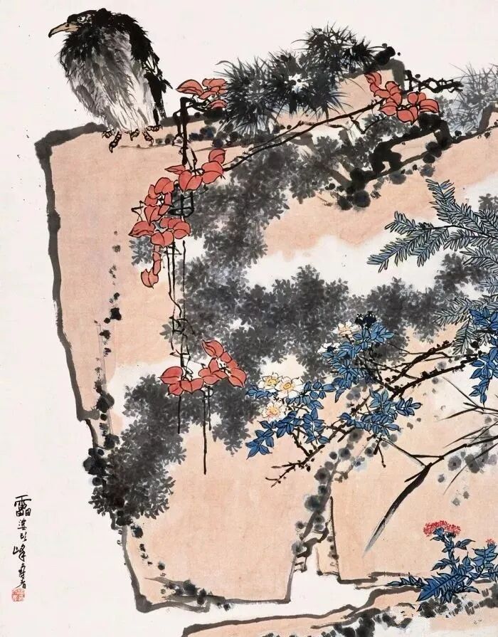 此幅《鹰石山花图》是集中体现潘天寿艺术风格、艺术主张的代表性作品,自成画以来便为世之所瞩,各方展览、著录前后计约二十余次。《鹰石山花图》舍去了文人画逸笔草草的随性,在反传统呼声此起彼伏的大环境下,最大限度地将传统养分与时代精神相结合,开拓出全新的花鸟画创作体系。