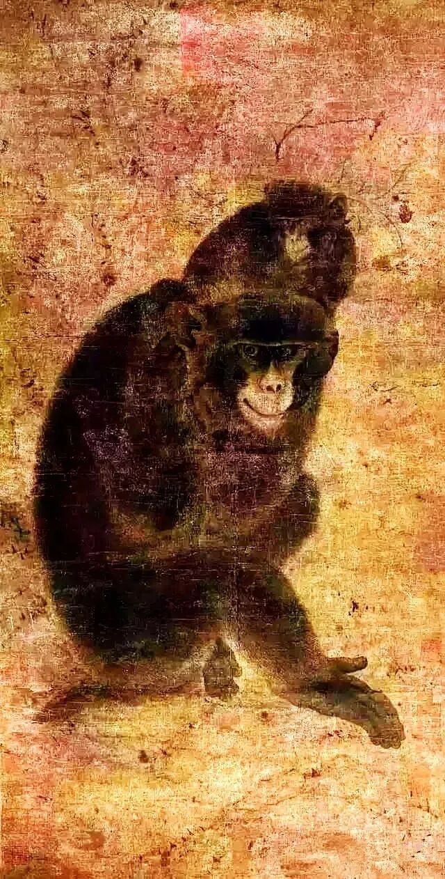 《子母猴图》画面背景隐隐约约是一座长满荆棘、杂树的野山,如此背靠大山的“大猴背小猴”之构图,还暗含“有靠山辈辈为侯”的寓意。