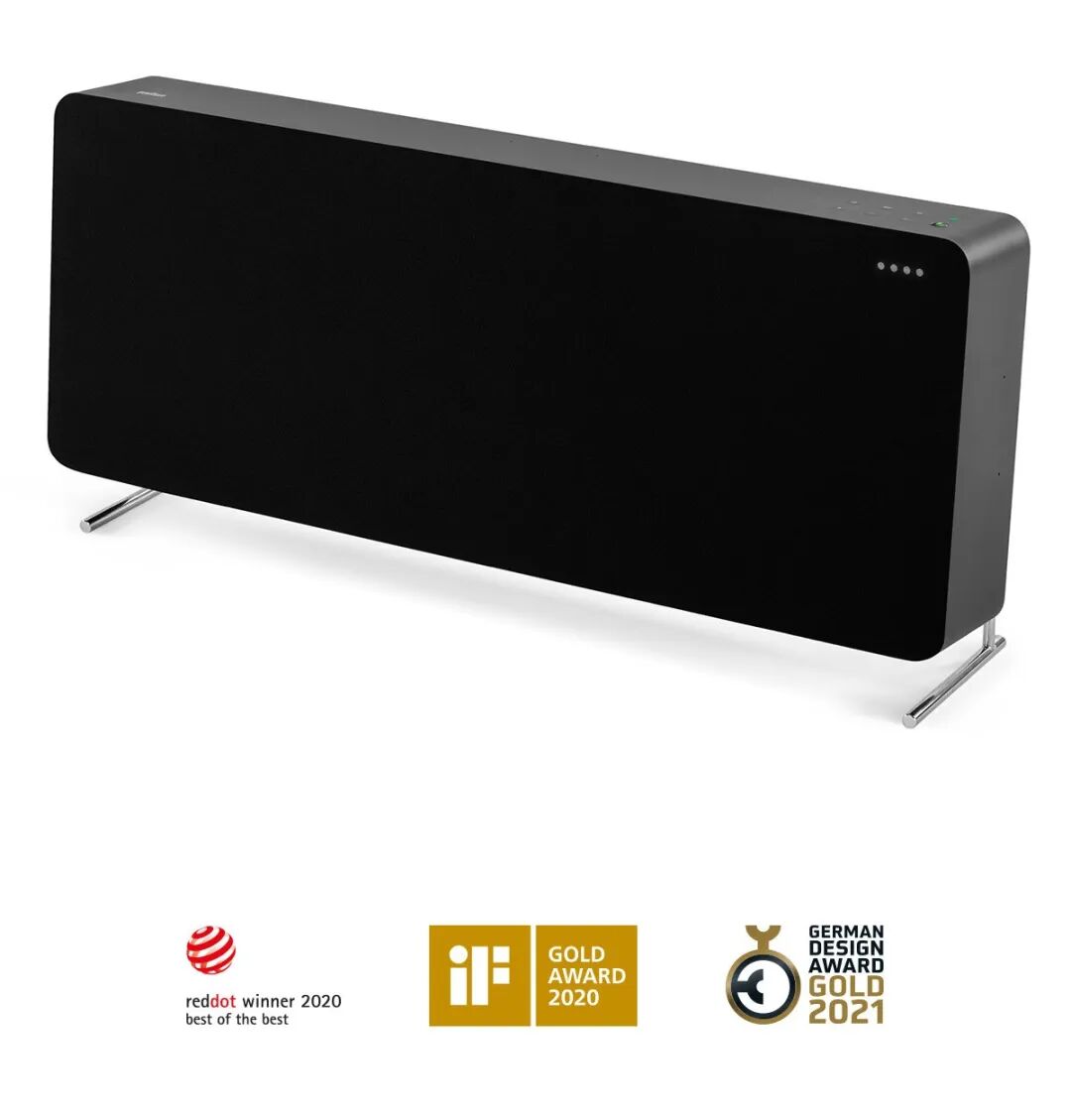 这款音响,拥有一个扁矩形灰色金属外框高亮的成的支架,像极了一件现代家具,而这2个特点构成款音响的主要视觉特征。