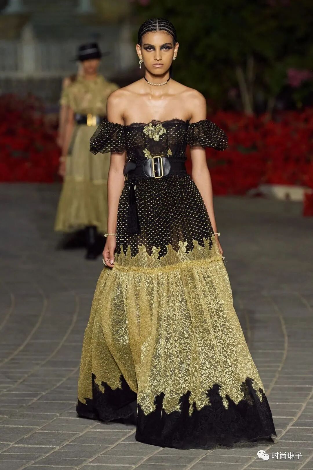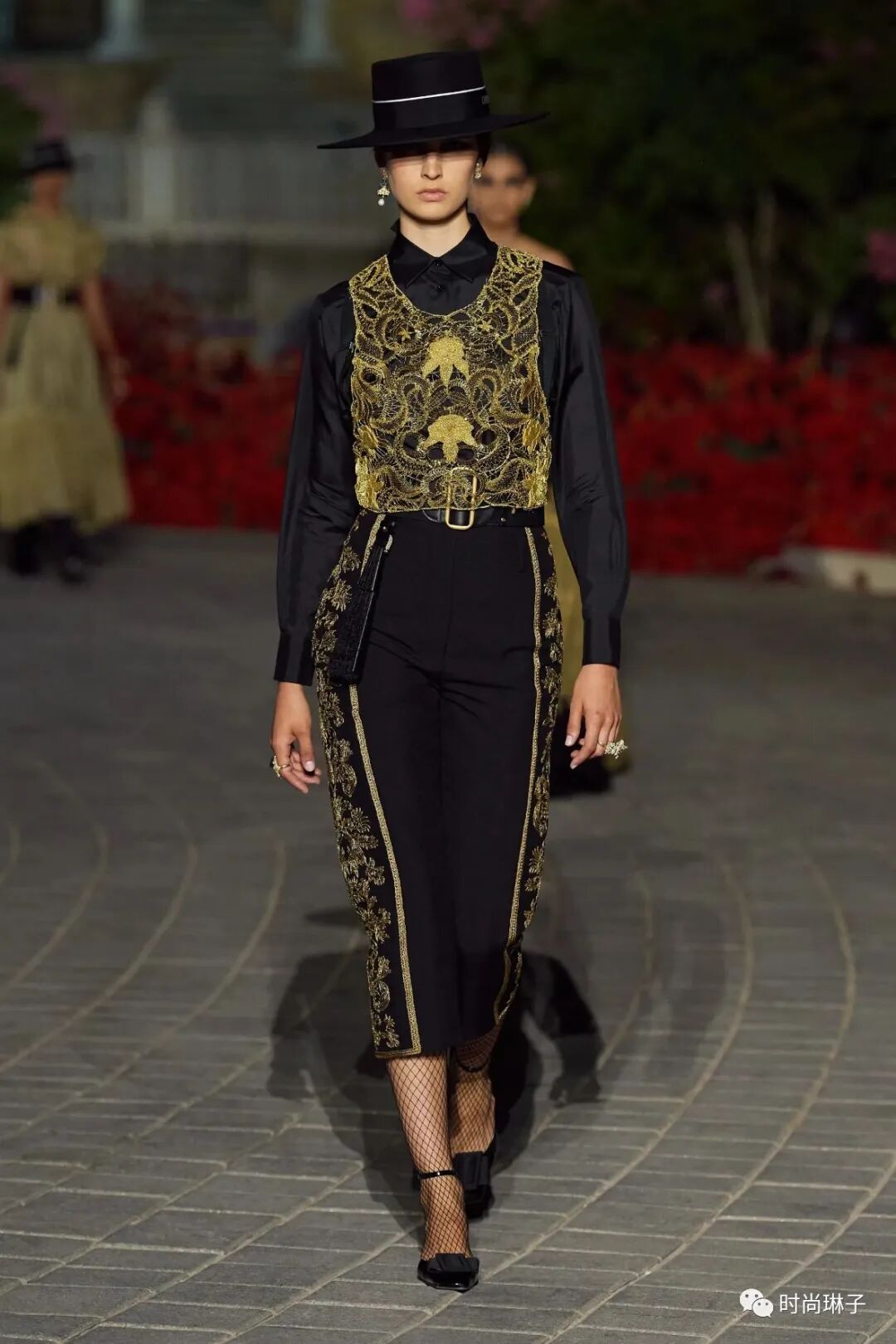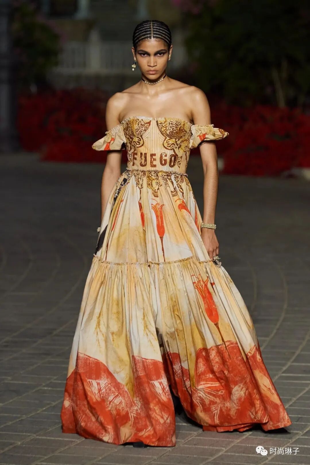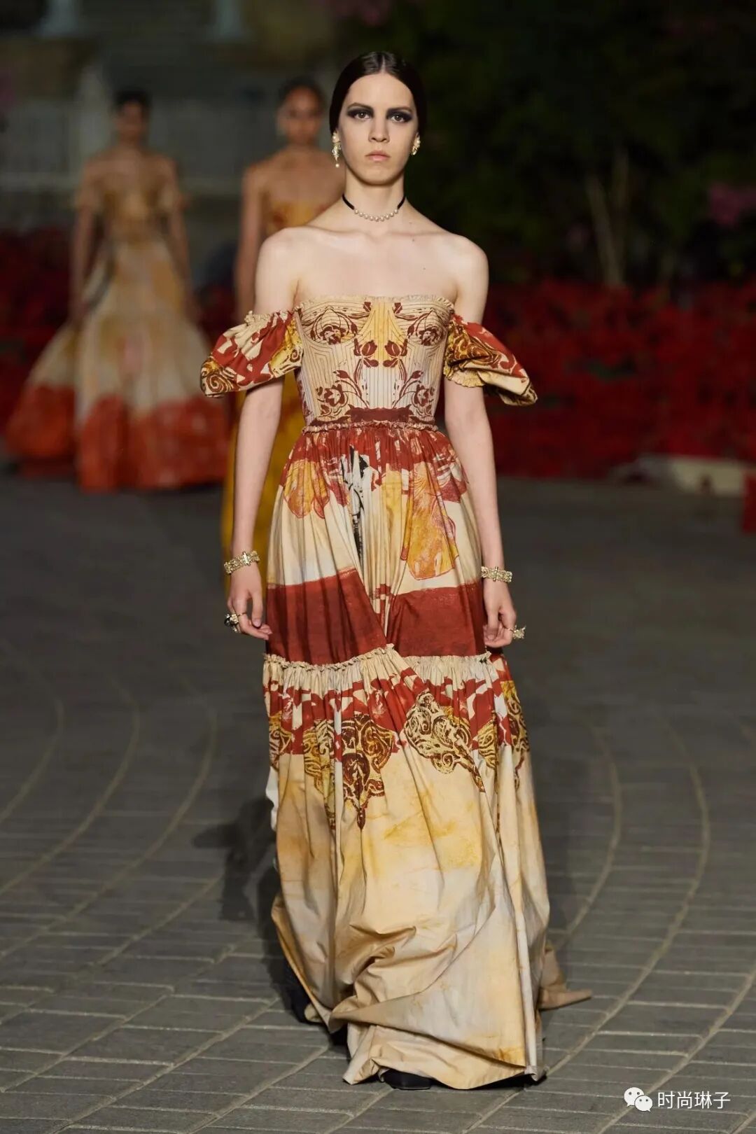 迪奥女装创意总监Maria Grazia Chiuri参观塞维利亚的大教堂时,深受刺绣艺术和卓越的纯银压花工艺启发,以此为灵感打造了一系列金色或银丝压花长裙。