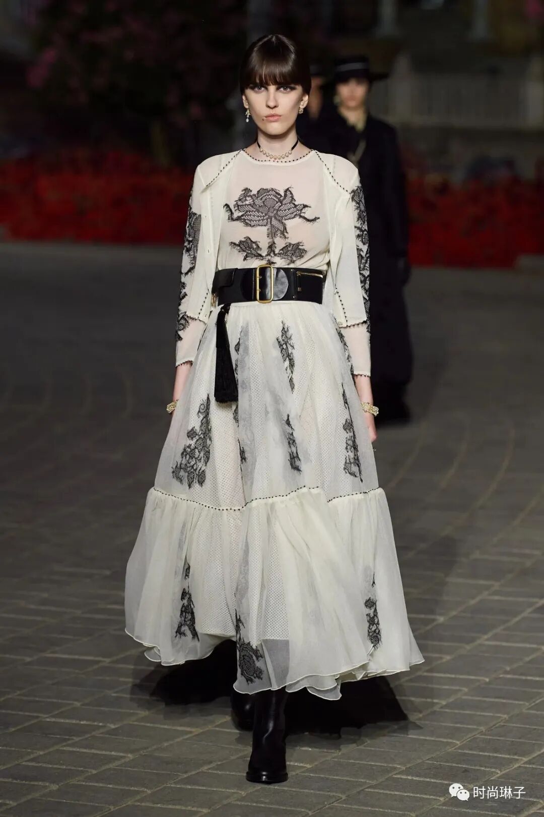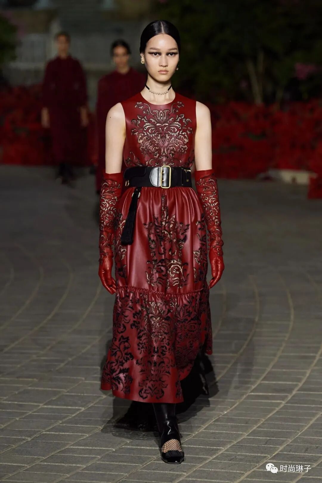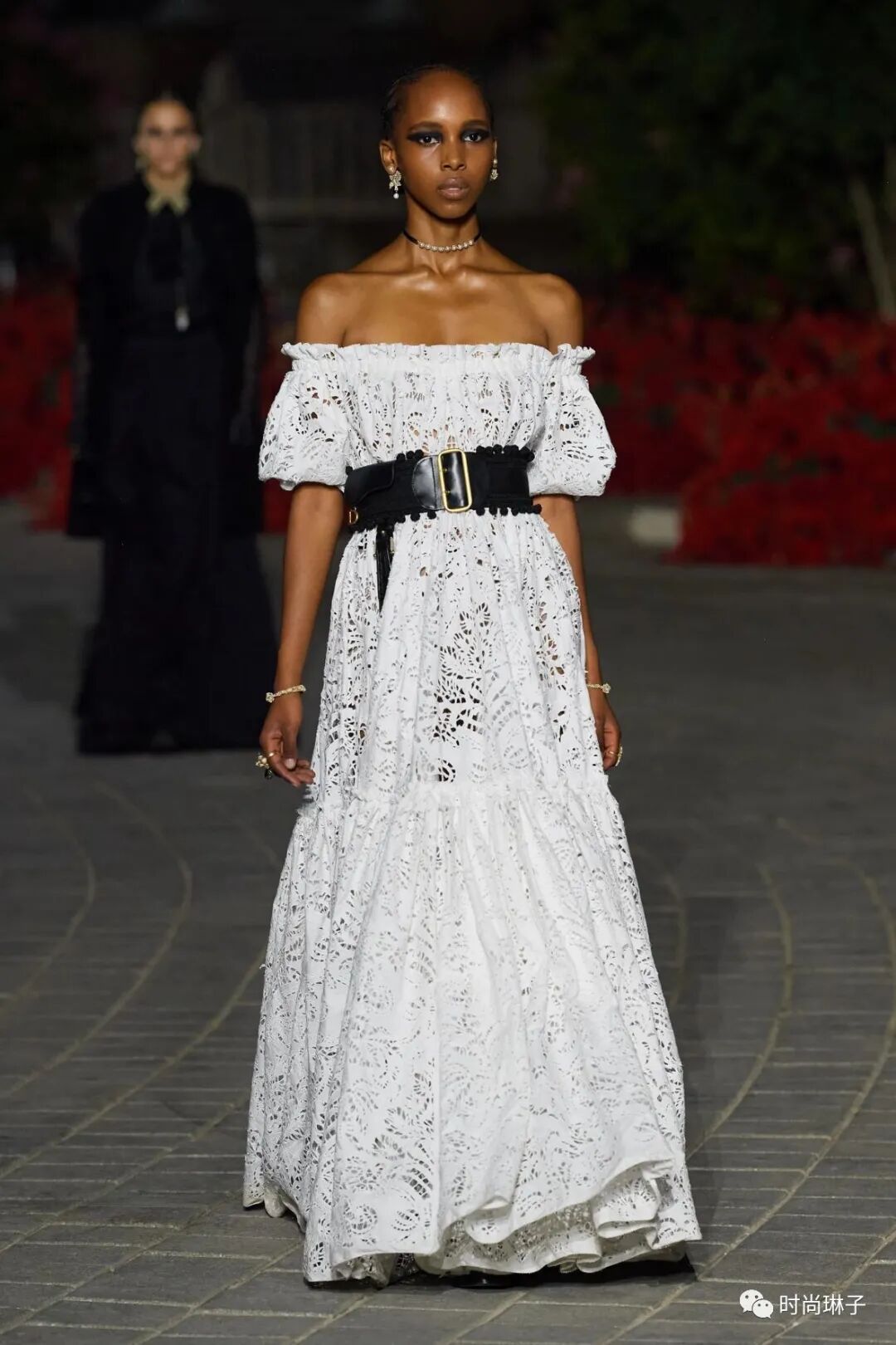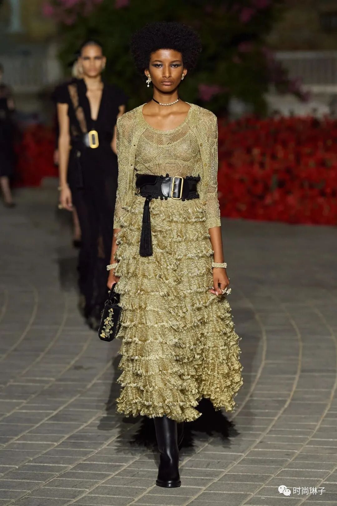 迪奥女装创意总监Maria Grazia Chiuri参观塞维利亚的大教堂时,深受刺绣艺术和卓越的纯银压花工艺启发,以此为灵感打造了一系列金色或银丝压花长裙。