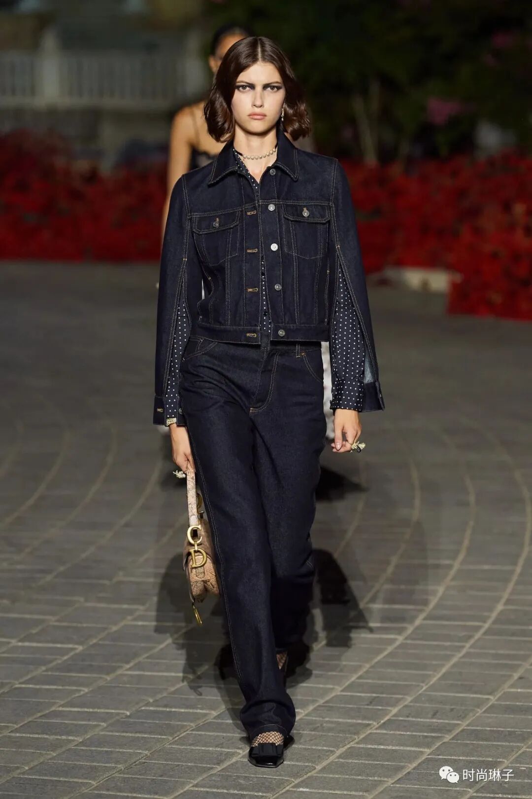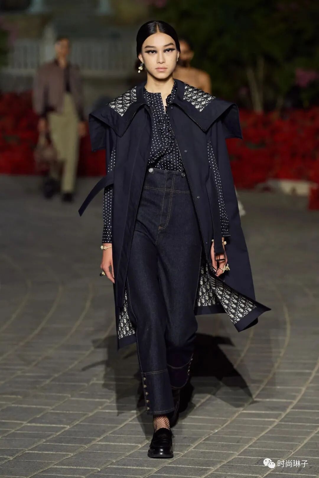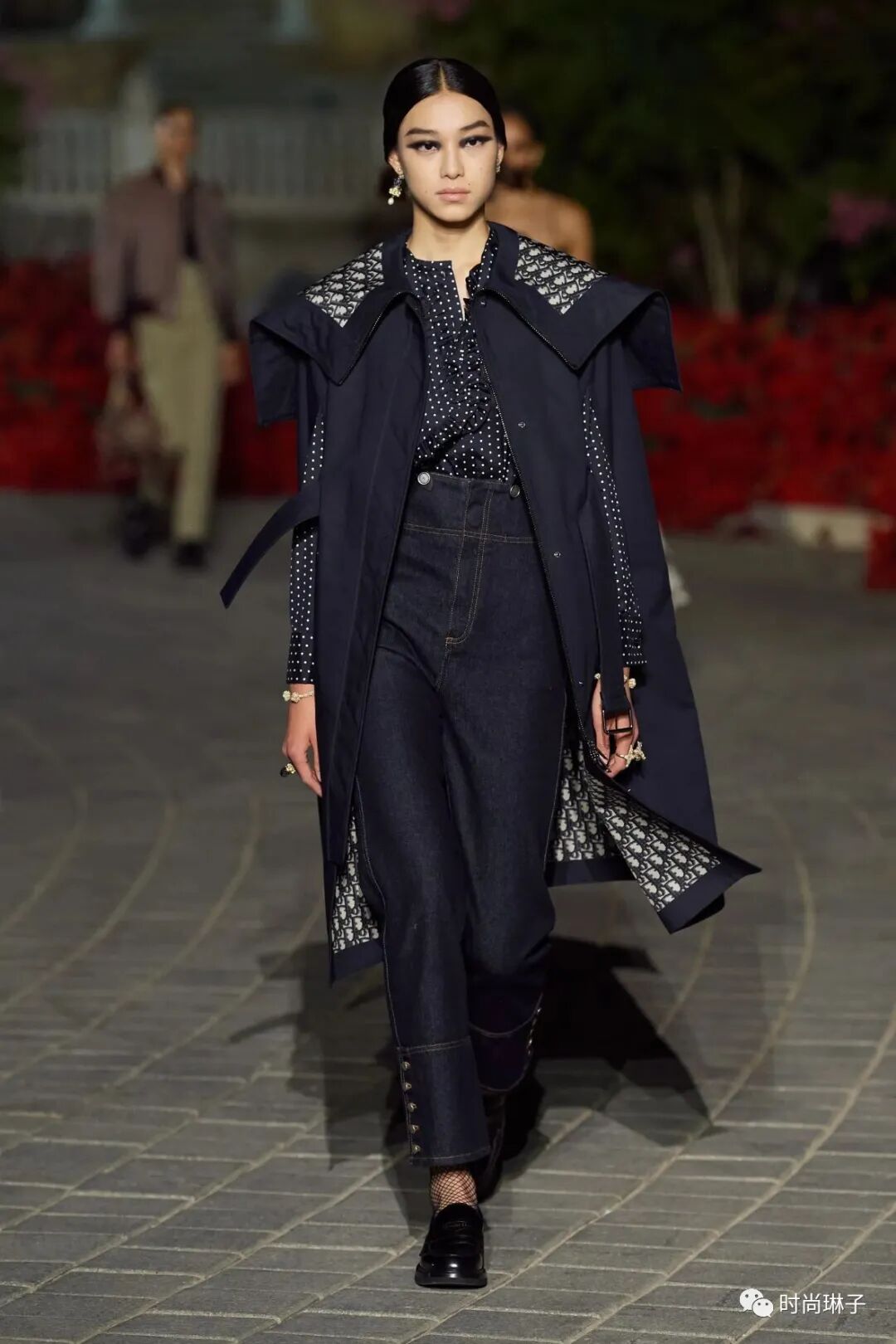 第二部分外观的色调以黑色,米色和浅灰色为主,造型融合了法式优雅格调与西班牙的热情风貌。经典的合身套装,简约的风衣,印有Dior标志的上衣和裤装,搭配牛仔造型,更显精致干练。
