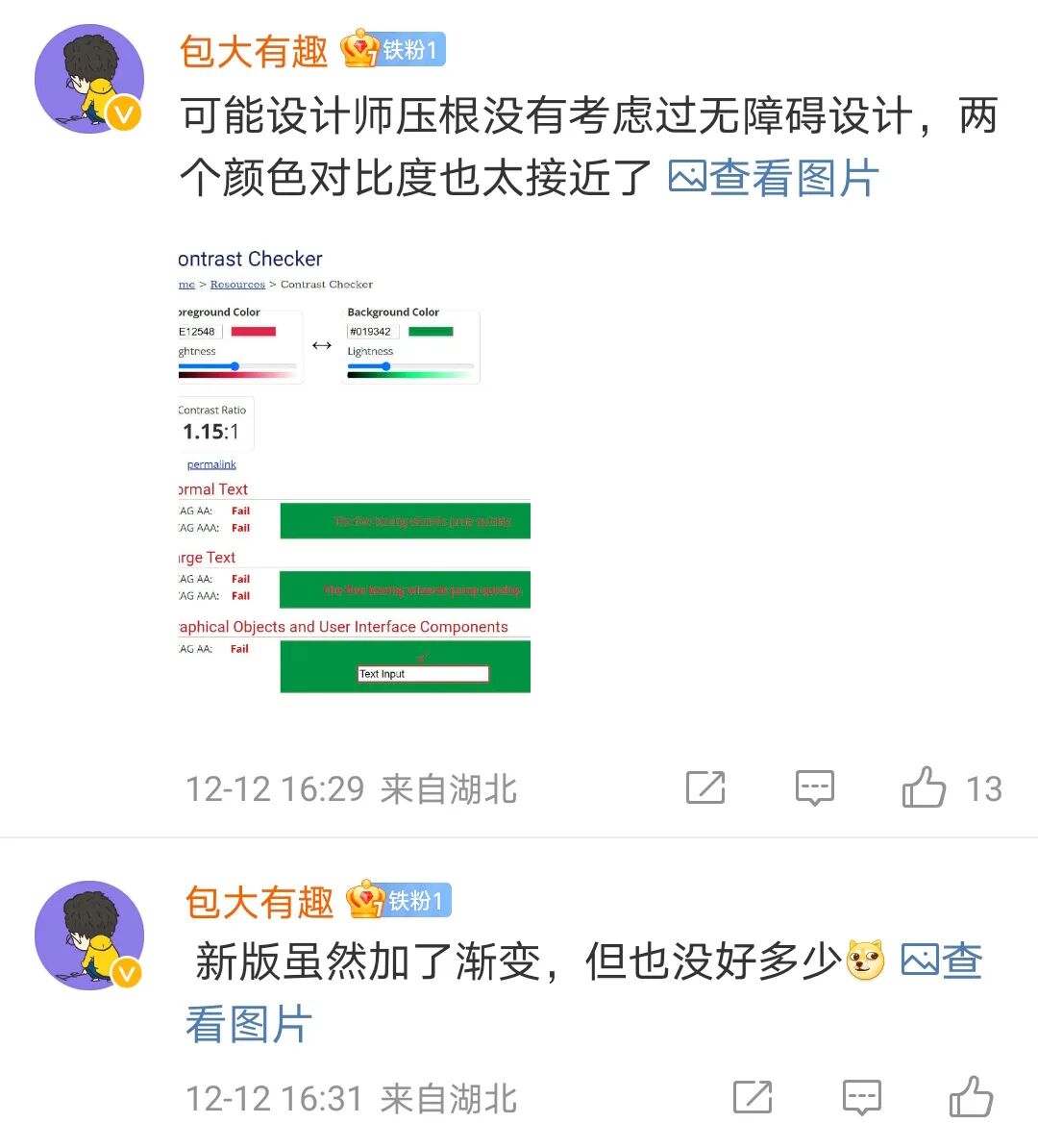 作品集2023-03-29 时隔一周「叮咚买菜」再次更新APP图标,网友:没好多少~ 前段时间,本以为“销声匿迹”的线上电商社区团购平台「叮咚买菜」突然改头换面,不仅升级了APP,优化界面布局改善用户体验的同时还用上了全新设计的品牌 LOGO。 无论是图标还是logo都去掉了厚重的描边改成了扁平风,却遭到不少网友吐槽“不如以前”,甚至有网友认为“太土、太接地气”……。 而仅仅时隔不到2周,「叮咚买菜」再次更新其 APP 图标。 本次更新一改早前的扁平风,而是为萝卜图形增加了立体感,同时颜色相比之前也更加鲜亮了。 整体视觉表现上,新版立体感的图标设计在视觉上确实更加凸显清晰,但依然遭到不少网友质疑,大部分网友认为两款图标都不好看……。 也有认为图标的颜色搭配上就不对: 不过,也有网友认为新版立体图标设计不错的,起码颜色上看起来更“新鲜”一点。 而作为我们优设专业的包大老师,也对此表达了自己的看法。他认为,新版图标设计虽然增加了渐变,但颜色对比度依然太过接近,设计师在设计师图标配色时似乎并没有考虑无障碍设计! 先在这里给大家普及一下什么是无障碍设计,无障碍设计简单的说其实就是设计师通过自己的专业能力,帮助那些有身体不便的人更方便地和这个社会连接沟通,让有障碍人士可以方便地、无障碍地获取信息和利用信息。 而这其中,色彩就是其中重要的一项。颜色可以用来区分信息数据的类别和维度,也可以帮助传达情绪等重要信息。然而,世界上有超过8%的男性和0.4%的女性都被色觉障碍的问题困扰,也就是我们日常所说的“色盲”。 因此,设计师在进行设计配色时应时刻自测,避免明度相似的橙黄绿两两配色和明度相似的红绿配色,因为这样的配色势必会造成色盲用户的可读性问题。尤其是红色在红绿色盲眼中并不是一种明亮醒目的颜色。相反红色对他们来说显得非常深,而暗红色则几乎接近黑色。 回到叮咚买菜更新的这两款图标,几乎都采用了比较暗的红绿色搭配,我们正常人看就了都会眼睛累,更何况有障碍人士呢? 在这里,小优不得不提一个同为生鲜电商平台的美国品牌Instacart 的品牌logo设计,同样使用的是「萝卜」作为主元素,更新后的图标却更加具有辨识度和小巧思。 △图中为Instacart 品牌的几次logo升级 △Instacart 品牌最新logo 首先是图标的变化,将之前完整的萝卜元素直接砍掉了一半,只露出了半圆形的胡萝卜头和萝卜茎叶,像被种在了土地中,让它看起来更新鲜、更有机,表达出品牌「种植增长」的理念。 而萝卜上茎叶设计的也非常具有巧思,将叶子设计成了一个向下箭头的形状,在众多交互场景中都可以发挥不同的作用,可以说设计上非常的用心了。 比如说小箭头的萝卜可以当做购物车的加购图标,又可以作为指向和图像转变的动态工具……。整体设计上,无论从图形标志取舍,到字体设计,还是调色板以及箭头与元素交互的方式,无疑是一次经过深思熟虑后才制定出来的。 不得不说,中国的设计之路确实还有很长的路要走,这也需要我们大家共同的努力! 最后,对于此次「叮咚买菜」图标设计的再次更新,你怎么看呢?欢迎在评论区一起聊聊吧!参与讨论还有机会获得优设公众号赠书福利哦~ 本文来自微信公众号“优秀网页设计”(ID:youshege)。大作社经授权转载,该文观点仅代表作者本人,大作社平台仅提供信息存储空间服务。 TAGS: 品牌图标萝卜设计颜色 相关文章Kleoniki Andr…这是大王Day.281获奖作品《2020最佳图书…精选头像|搞怪来袭!安东尼奥·布埃诺 作品配色清新梦幻的场景插画,充…美国Jennifer Mc…【小鹏设计】设计小改/动力…【首发】地点空间丨打破空间…谢商家不坑之恩!只骗有钱人…