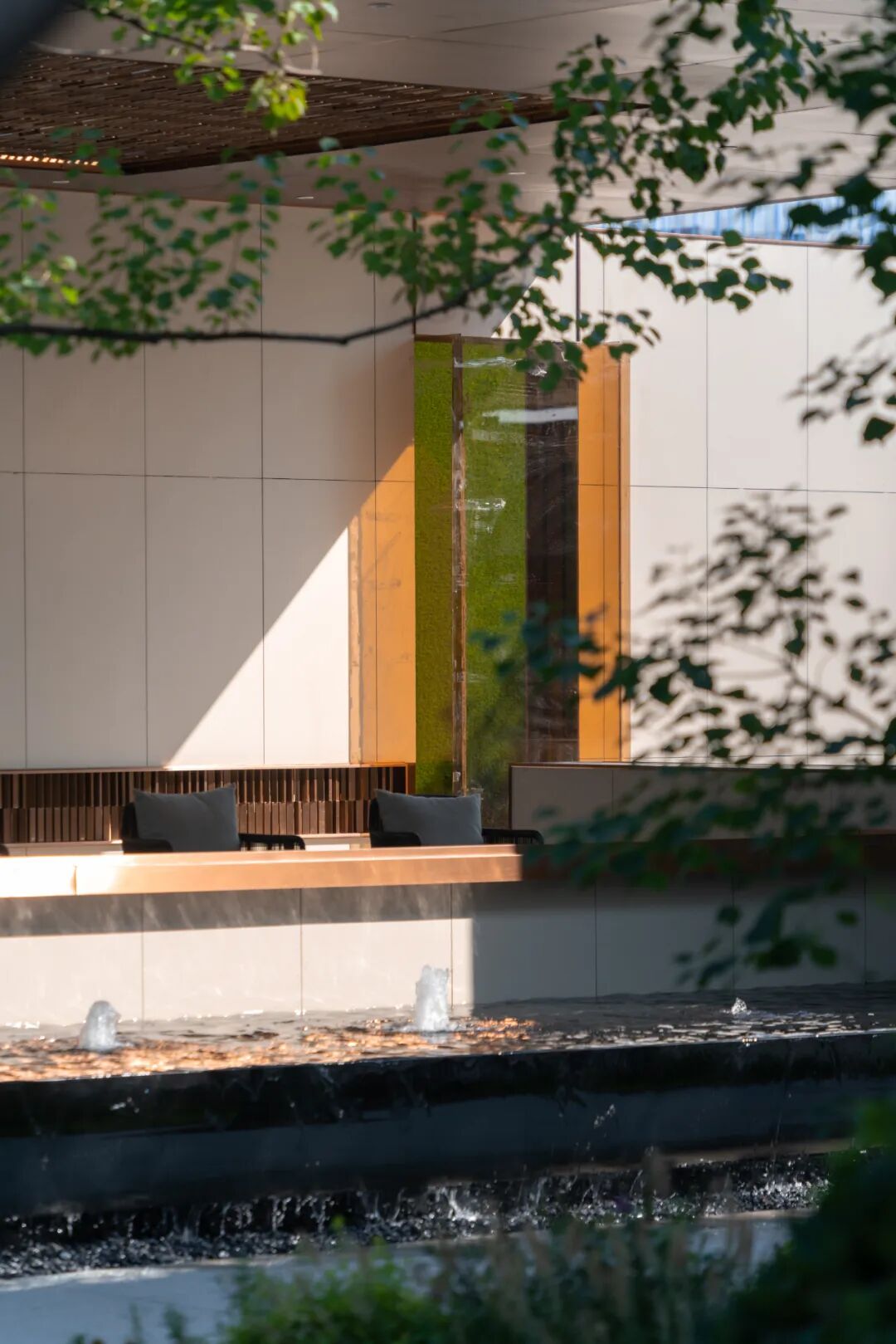 于林荫下,伫立临水吧台,跌级而下的水面,自然肌理的景石,听水声、赏景石,去欣赏流动与静止、触摸坚硬与柔软,感受自然中的时光流转。极简的东方美学,亦是高贵的体现。颜色、质感、肌理的碰撞,亦是生活的本质。