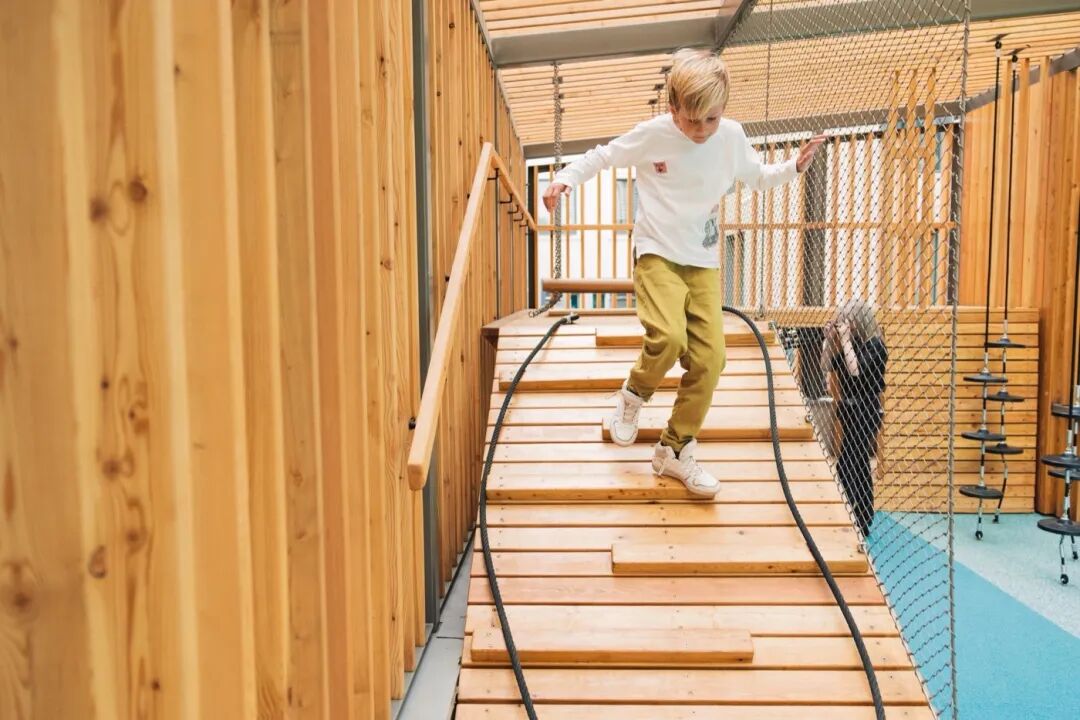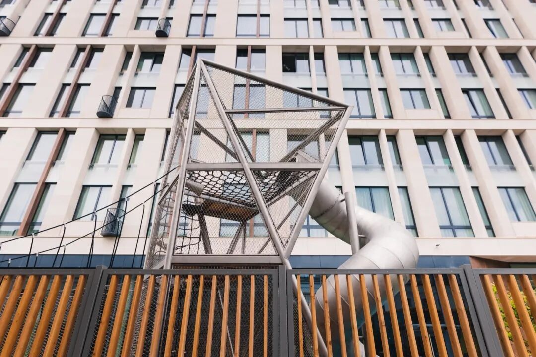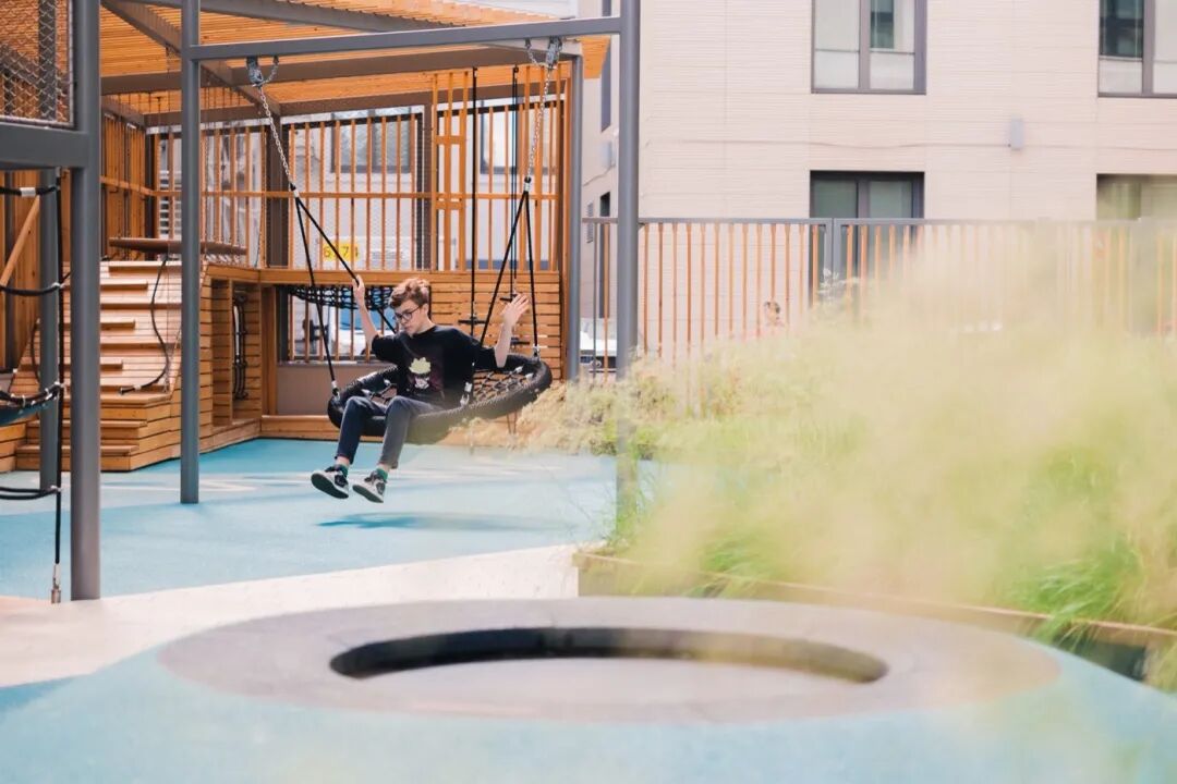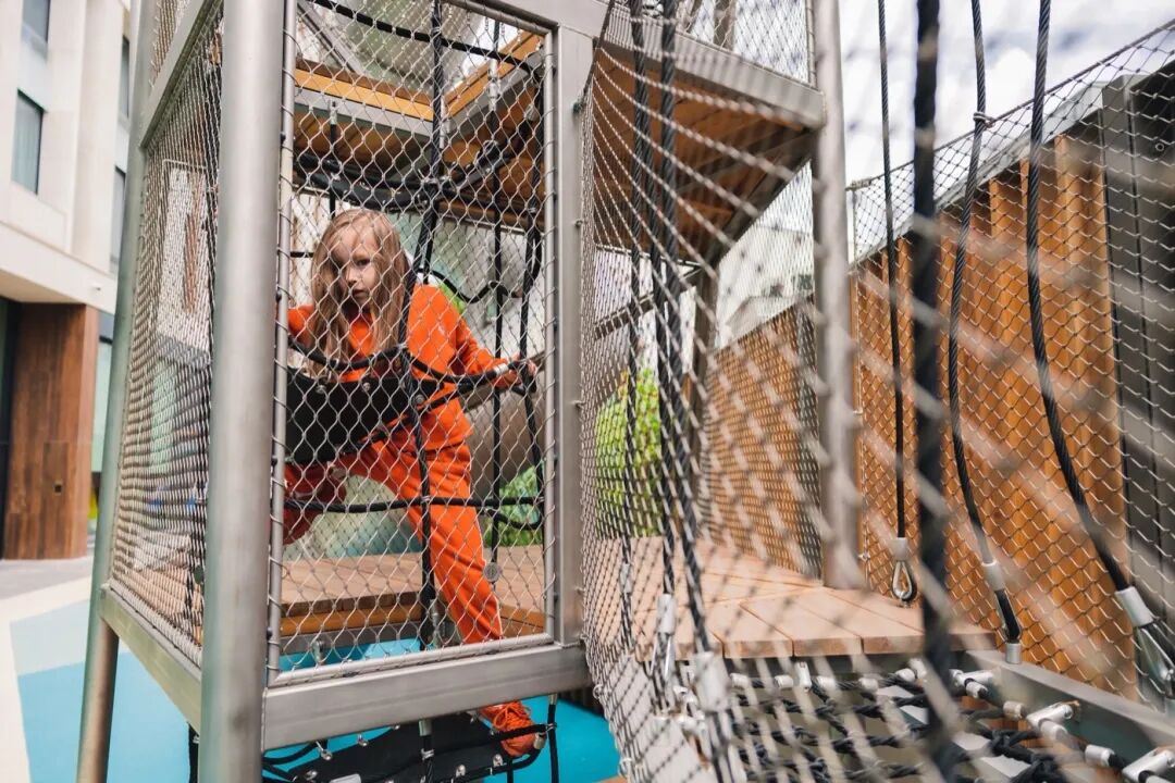 旁边有一个游戏平台和攀爬综合体,有斜滑梯、平衡用的错桥、下行用的索道、秋千和蹦床也是该空间的一部分。