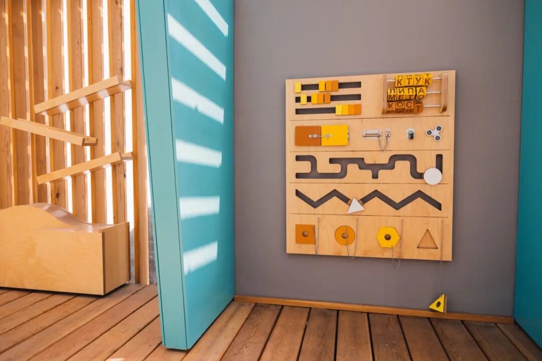 A tactile panel has different natural pieces which can be touched and examined, and there is a «busy board» with locks and components, a car track and so on.