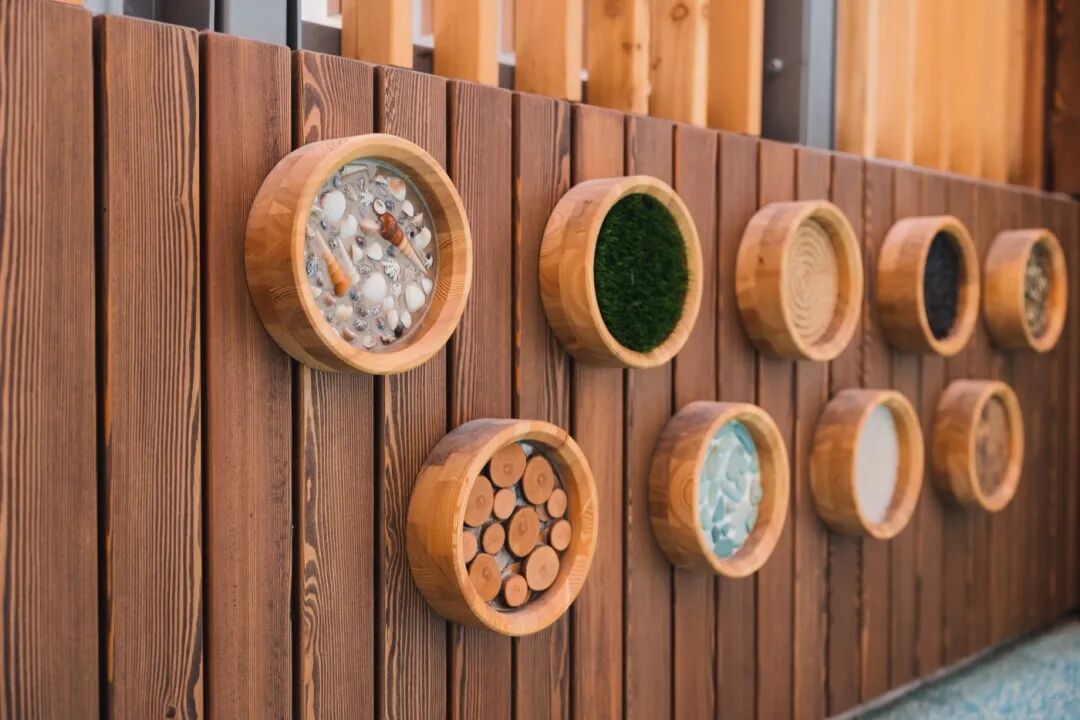 一块触觉板上有不同的自然碎片,可以触摸和检查,还有一块带有锁和组件的 "忙碌板",以及一条汽车轨道等等。