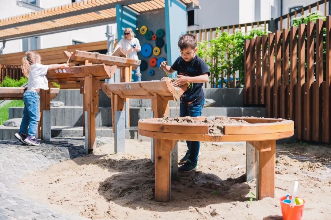 The sandpit to experiment with dry and wet sand and a slate board is also distinctive of this part of KID’S LAB.