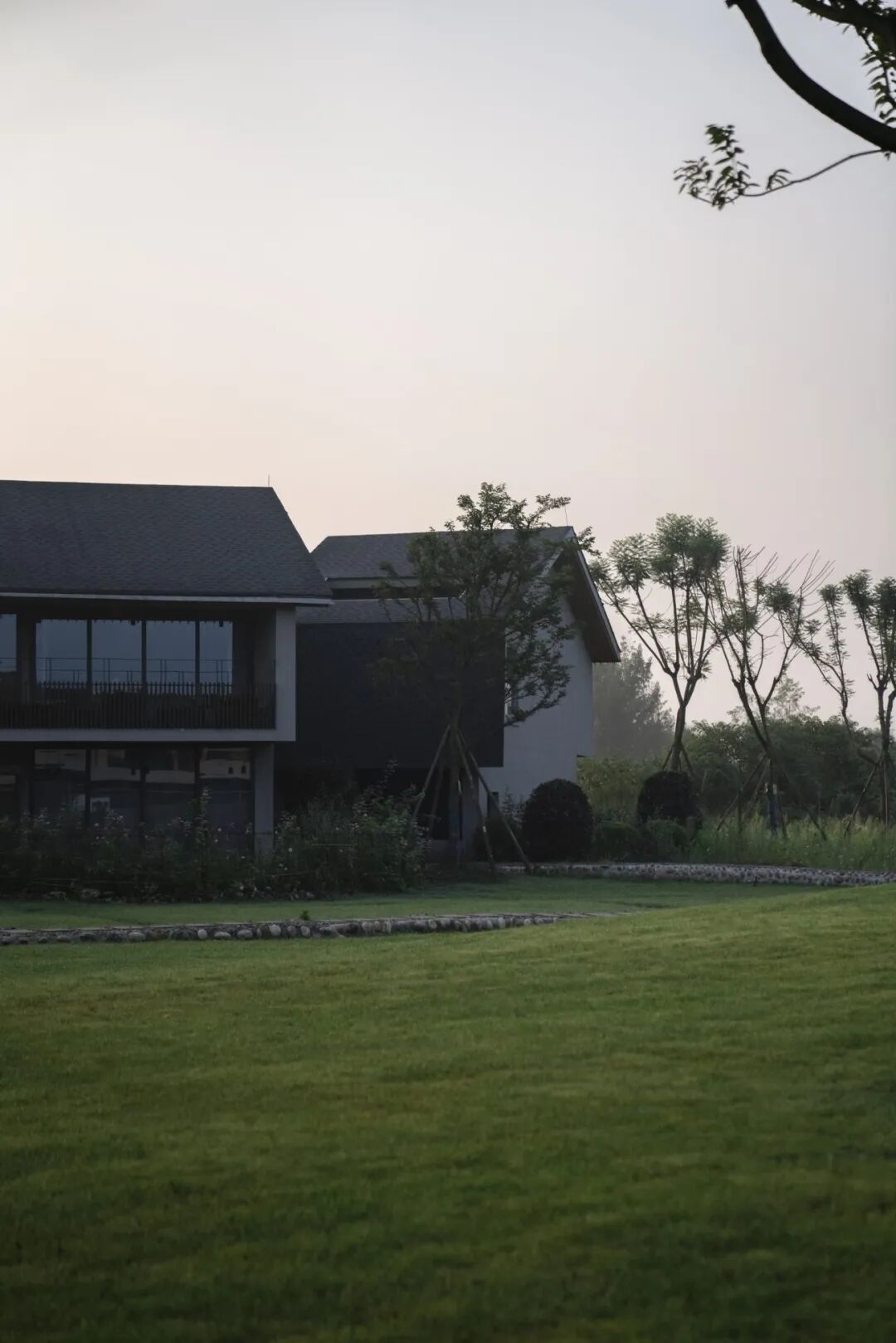 为了制造从田野外部看起来,建筑贴近地面的形象,通过二层阳台的下沉花池,来调节建筑立面的比例,降低视觉重心。二层整体悬挑而出的阳台,连续舒展的坡屋面,精致的金属檐口,这一切都让建筑更加平行于田野,呈现出一种让人倍感安静的水平感。