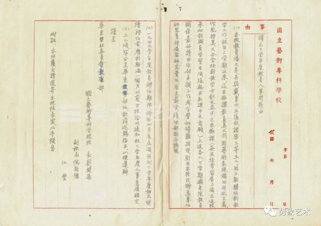 1928年4月,中国现代艺术的奠基人蔡元培继创办北平美术专科学校,并在委任林风眠担任该校校长失败后,深感需要另起炉灶,建设一个全新的艺术教育基地,于是择地杭州,创办了国立艺术院。可以说,这是当时中国以国立名义创办的最高规格的艺术高等学府。在蔡元培的人才库里,林风眠是校长的不二人选,他的女婿林文铮是艺术史专家,精通法文,有很强的组织能力,是教务长的合适人选。剩下的几大教授,李金发担任雕塑系主任教授、刘既漂担任图案系主任教授,吴大羽担任西画系主任教授。通过吴大羽介绍了来自上海新华艺专的国画系主任教授潘天寿。这确实是一群朝气蓬勃的艺术人才群体,校长林风眠28岁,吴大羽不满25岁。建院之初,国立艺术院职员19人,教授8人。以“介绍西洋艺术,整理中国艺术,调和中西艺术,创造时代艺术”为宗旨,春季招收新生80余人,学制5年,正式上课时仅56人。
