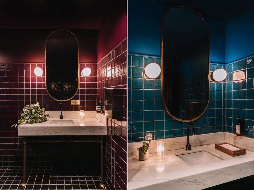 在这个洗手间里,工作室增加了带有镀金框架的长方形镜子,然后用镀金的灯和配套的配件强化了这种设计语言,墙壁和家具的深色调也有助于金属更加突出。