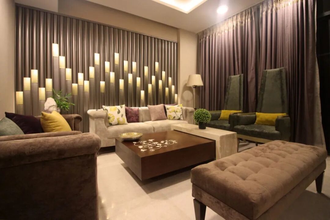 星暴、太阳形式和阶梯图案是这个时代的其他特征元素。这些几何形状经常用于壁纸、模具、镜子甚至建筑外墙。印度的这所装饰艺术风格的公寓以墙板的形式展示了这些图案,将不同长度的弯曲和平板与嵌入式灯具错开来实现戏剧性的客厅墙壁布置。