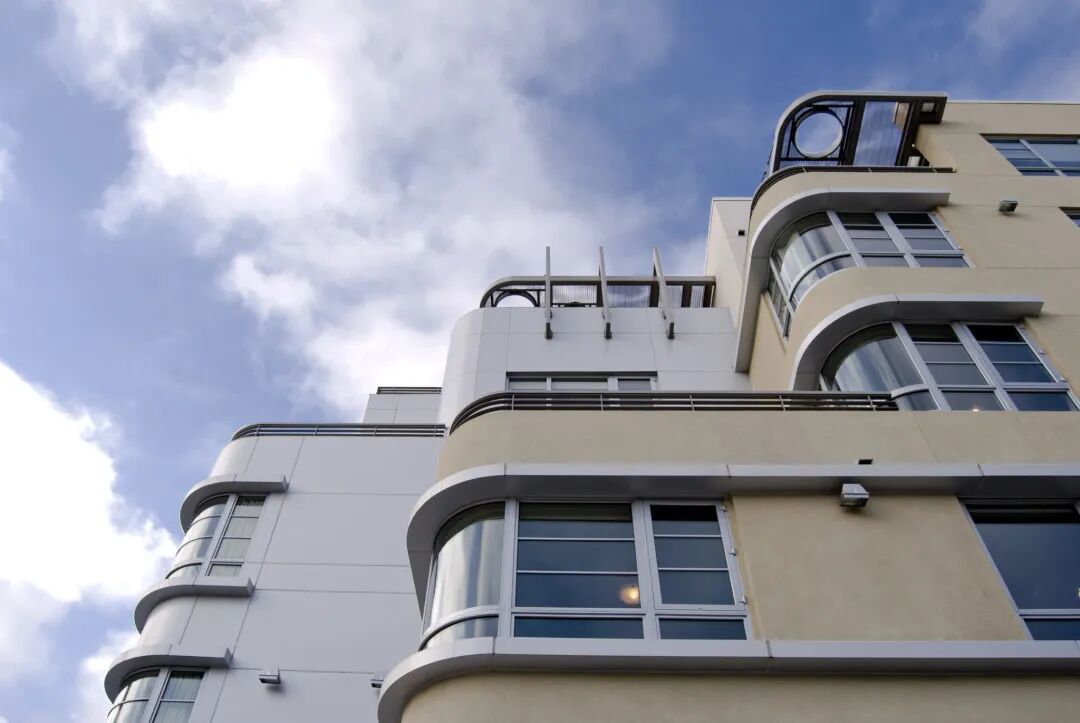 风格以不同的形式表现在外部,世界上最具标志性的装饰艺术建筑总是模仿旧远洋客轮的线条和形式,弯曲的边缘、平屋顶、窗带、圆形开口、水平带、船栏杆和z形装饰只是几个例子。