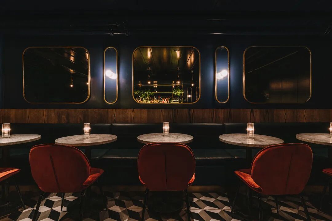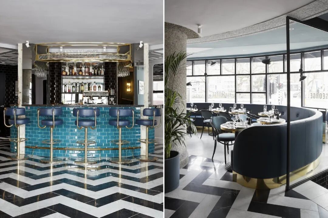 圣乔治餐厅大胆的地板与明亮的绿松石和丰富的翡翠色调相结合,营造出一种复古的美感,而又不会过于压倒性。
