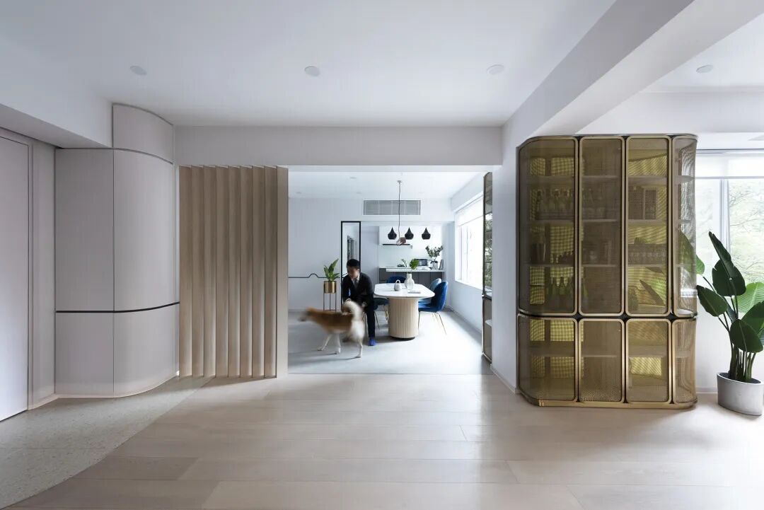 曲线形式和简洁的线条从那个时代的汽车和远洋客轮中汲取灵感,也成为了30年代风格的一部分,案例以现代方式做同样的事情,角落、墙边和家具轮廓都赋予了光滑的边缘或弯曲的轮廓,甚至可以复制到橱柜门和墙隔板中,又在餐桌上添加凹槽,让曲线以较小的比例融入其中。