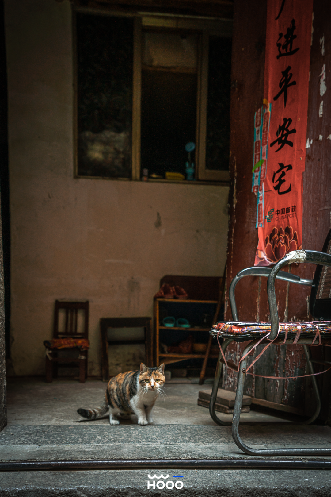 狸花猫在宅子门前伸懒腰