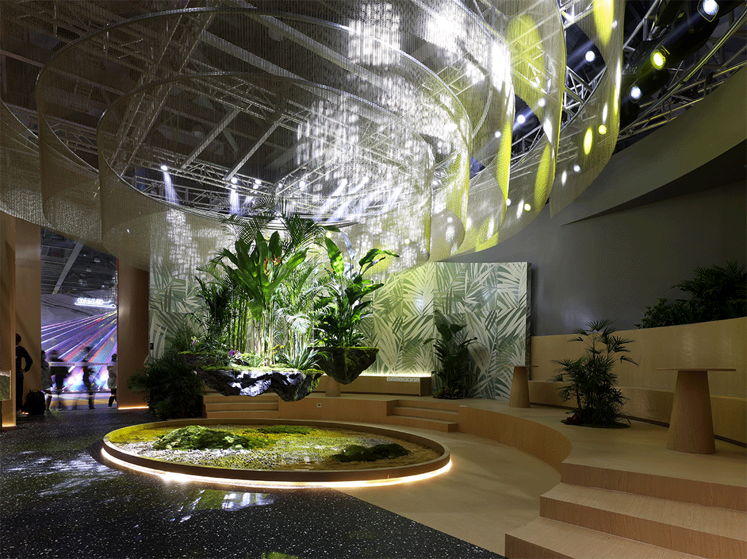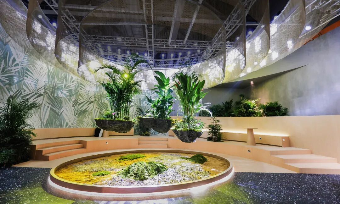 圆形的“可持续展览”空间围绕绿洲延展开。自然植物景观与现场的灯光设计诠释出环保人居的美好愿景。